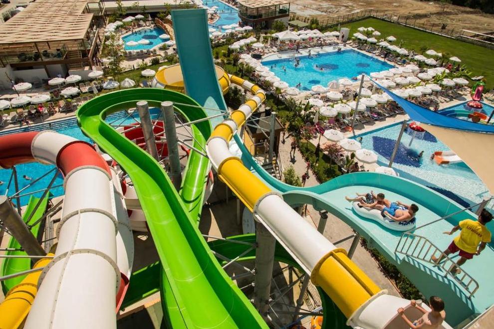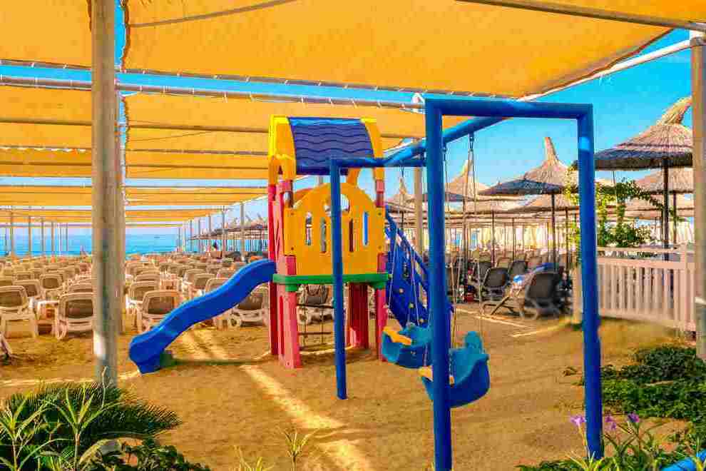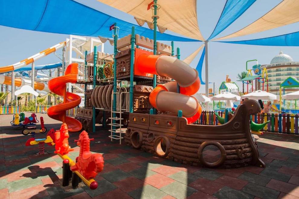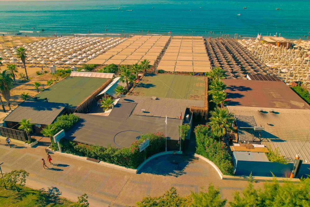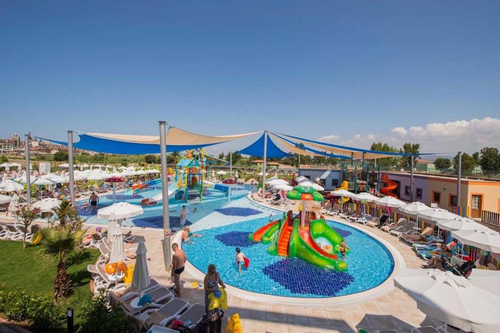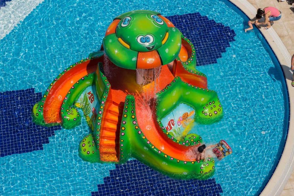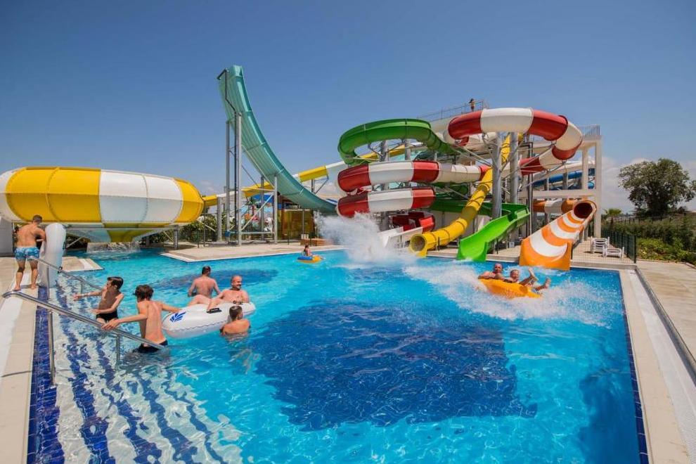 Собствен пляж с фин пясък и плавен преход, на плажа има бар и снек-бар. Намра се на около 1000 м от хотела, осигурен е безплатен шатъл. 6 открити басейна, в това число релакс-басейн (16+). Детски свят с басейн с пързалки и аквапарк с 10 пързалки - както за възрастни, така и за деца (пързалките в аквапарка са отворени между 15 април и 15 октомври. Извън тези дати, те могат да варират в зависимост от метеорологичните условия). На плажа и при басена чадъри, шезлонти, хавлии се ползват безплатно.
