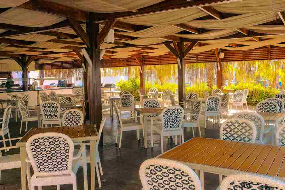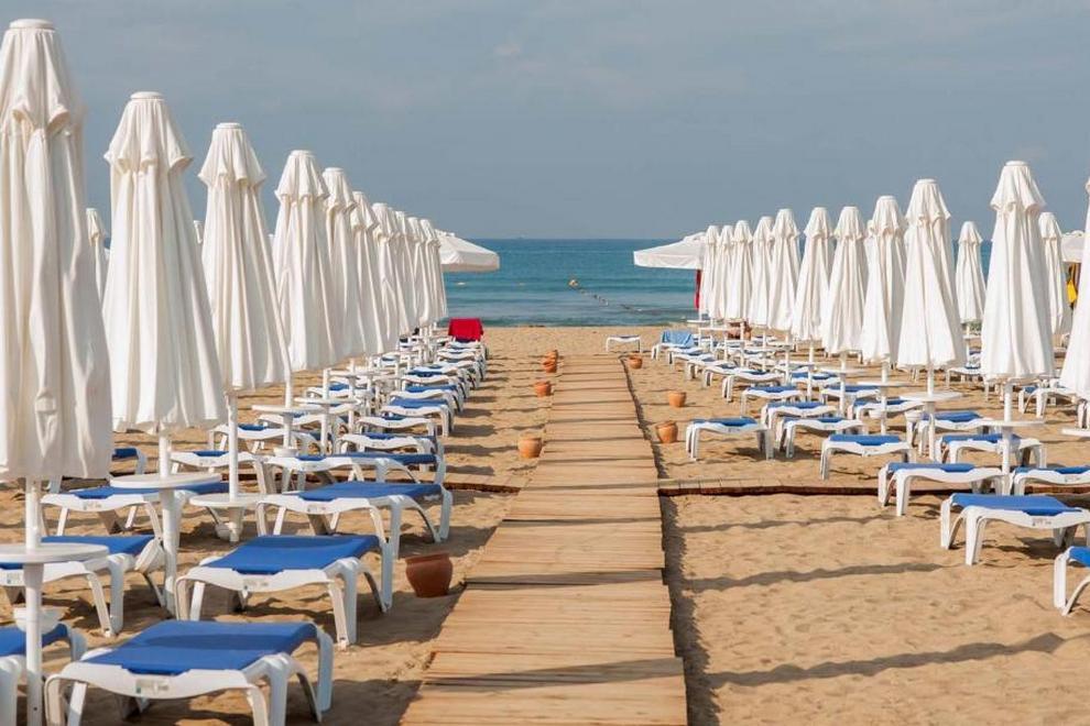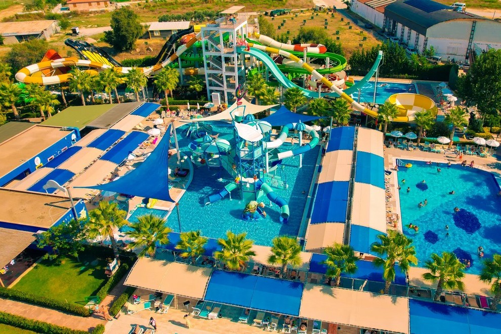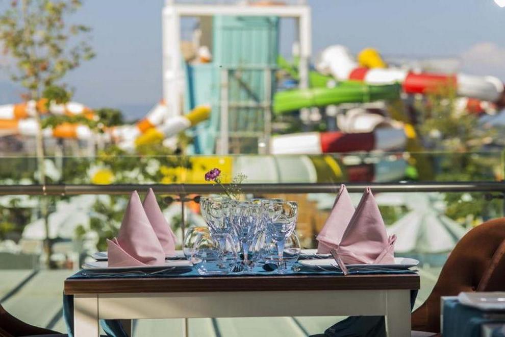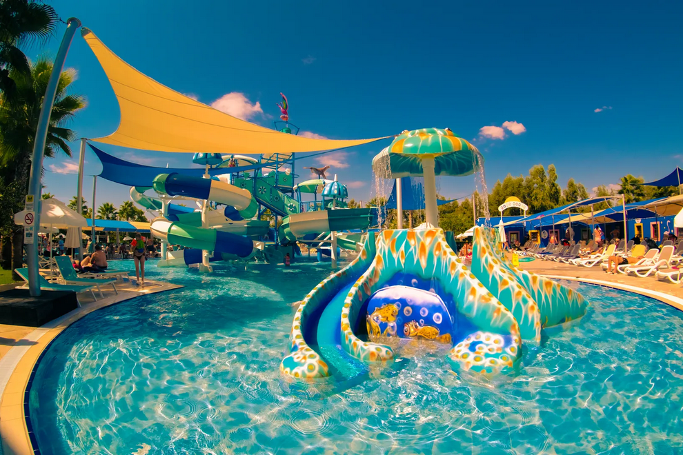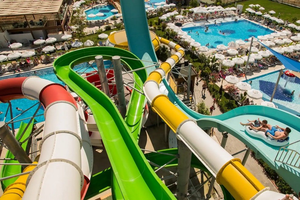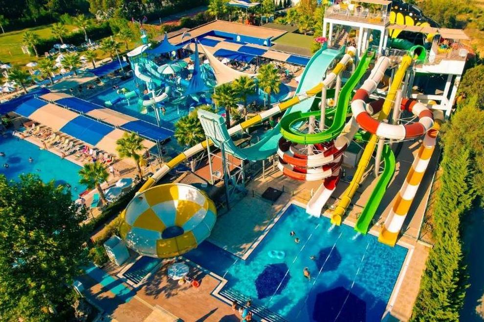 Собствен пляж с фин пясък и плавен преход, на плажа има бар и снек-бар. Намра се на около 1000 м от хотела, осигурен е безплатен шатъл. 6 открити басейна, в това число релакс-басейн (16+). Детски свят с басейн с пързалки и аквапарк с 10 пързалки - както за възрастни, така и за деца (пързалките в аквапарка са отворени между 15 април и 15 октомври. Извън тези дати, те могат да варират в зависимост от метеорологичните условия). На плажа и при басена чадъри, шезлонти, хавлии се ползват безплатно.