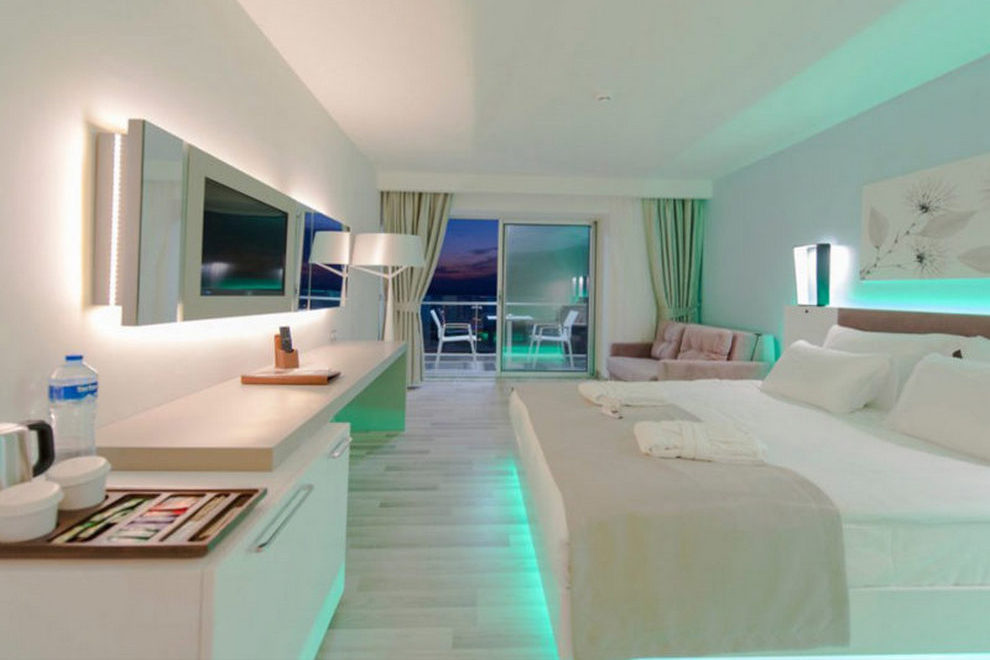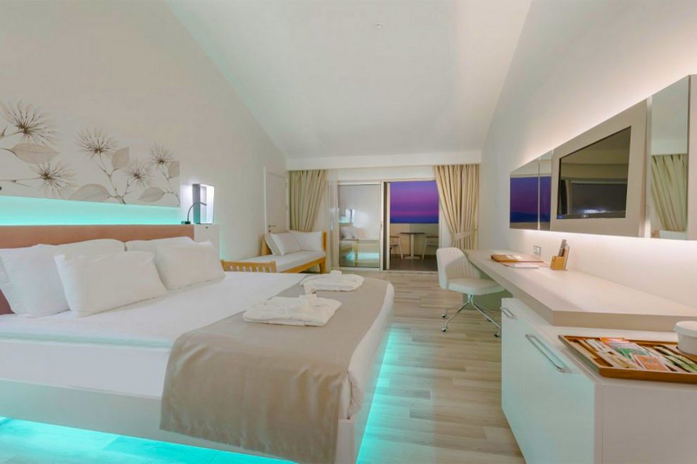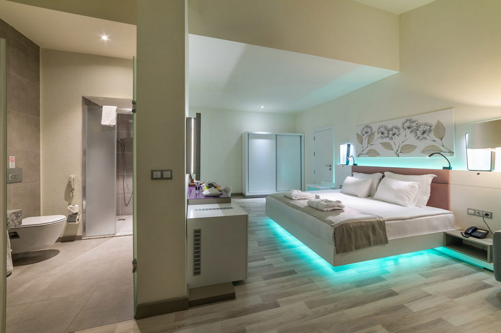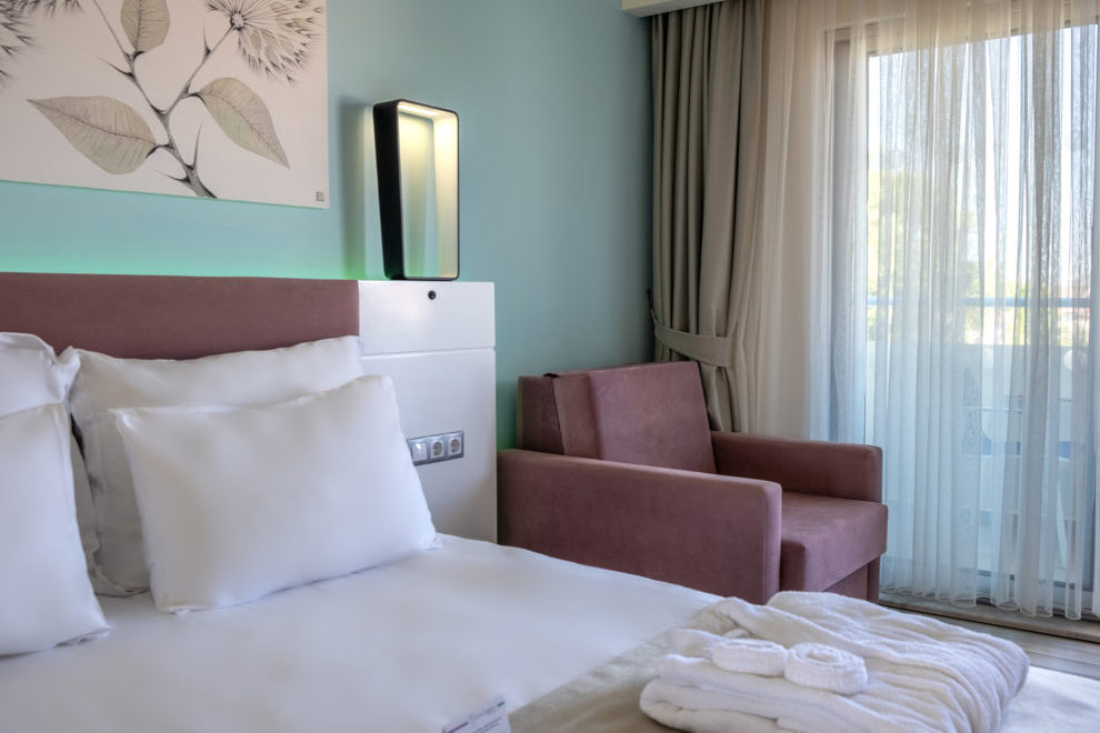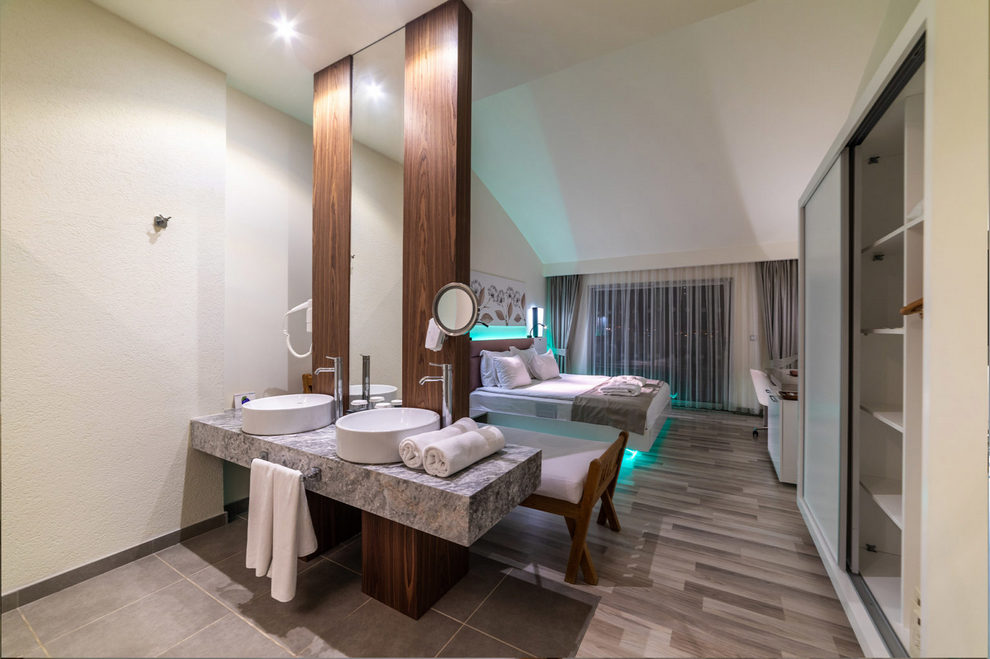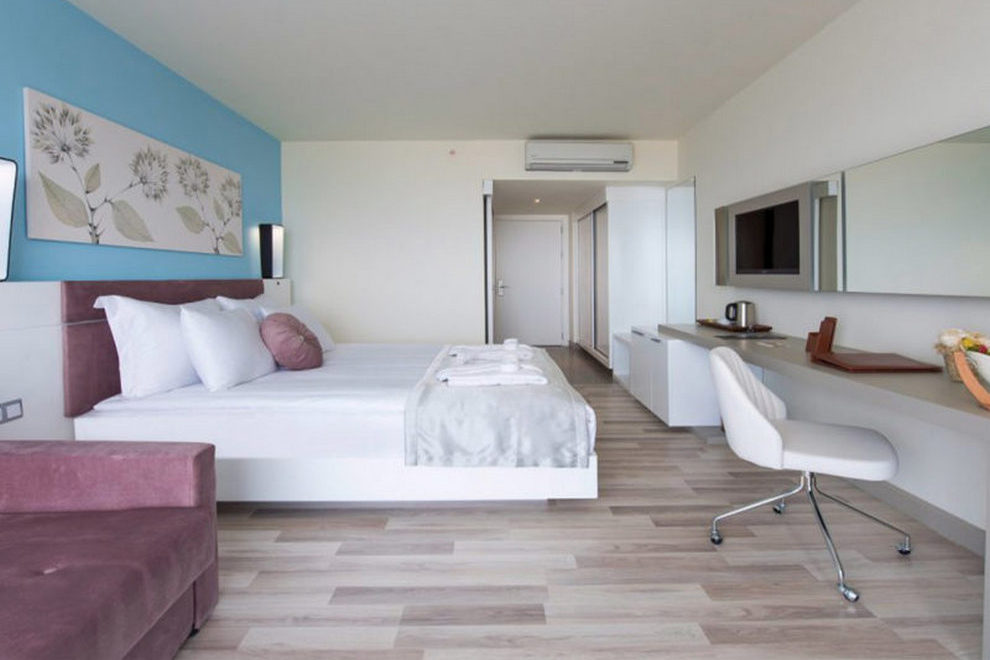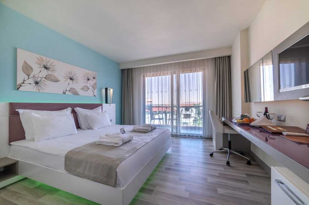 Хотелът се състои от една основна сграда (5 етажа, 2 асансьора) и два допълнителни корпуса. В тях са разпределени 256 уникално обзаведени, климатизирани стаи за гости. В основна сграда: 49 Deluxe room land view (29-32 кв.м); 21 Deluxe room sea view (29-32 кв.м); 7 Deluxe superior sea view room (разполага с голяма тераса с кът за отдих - 50 кв.м); 2 Handicapped (пригодени за хора с ограничена подвижност); 43 Family suite side sea view (1 стая със спалня, 1 стая с единични легла, 1 баня- 38-45 кв.м); 12 Family suite land view (1 стая със спалня, 1 стая с единични легла, 1 баня - 38-45 кв.м); 1 Senior Suite (50-90 кв. м), 4 Penthouse Suite (50-90 кв. м). В анекс сграда: 82 Standard Land View Room (23 кв.м); 16 Swim up room (cтаите са с директен достъп до басейна - 23 кв.м. Не се допуска настаняване на деца до 16 г.), 1 Senior Suite (50-90 кв.м). Всички стаи са оборудвани с телевизор, телефон, сет за чай/кафе, минибар (ежедневно зареждане с вода и безалкохолни напитки - безплатно), сейф (безплатно), баня с душ, сешоар, сапун и шампоан, балкон, Wi-Fi (безплатно). Почистване на стаите - всеки ден, смяната на спалното бельо и кърпите - 3 пъти в седмицата.
