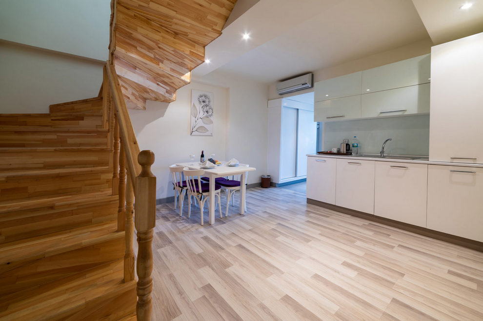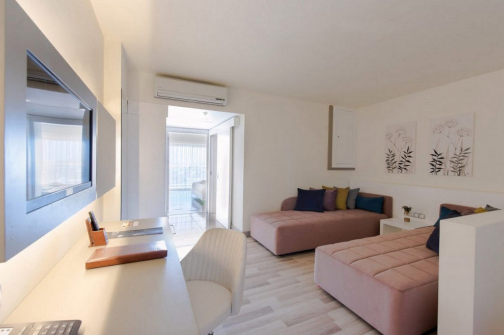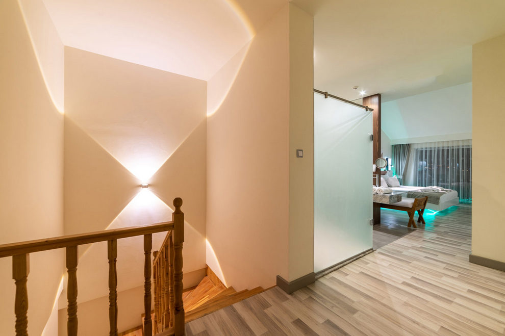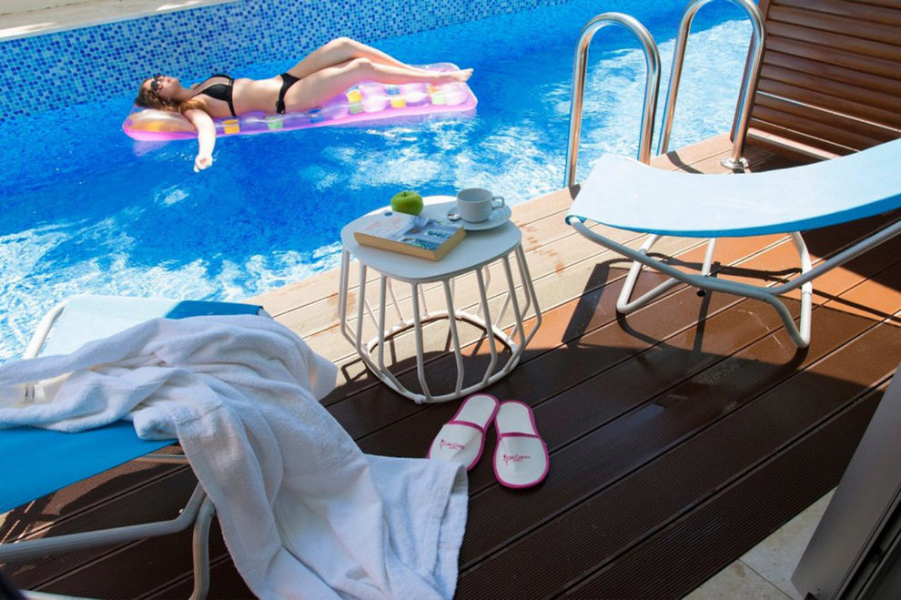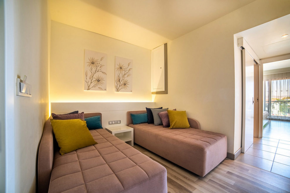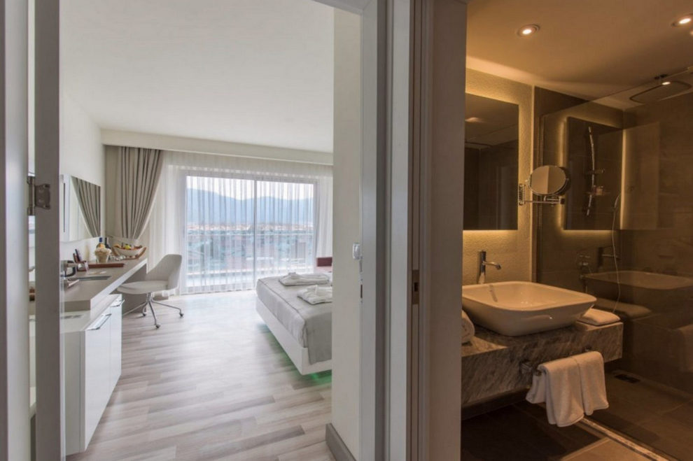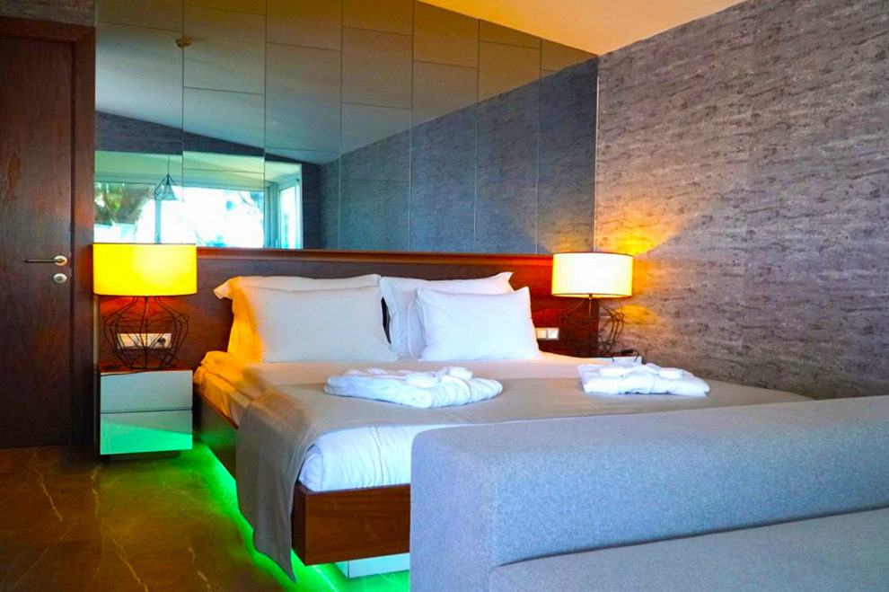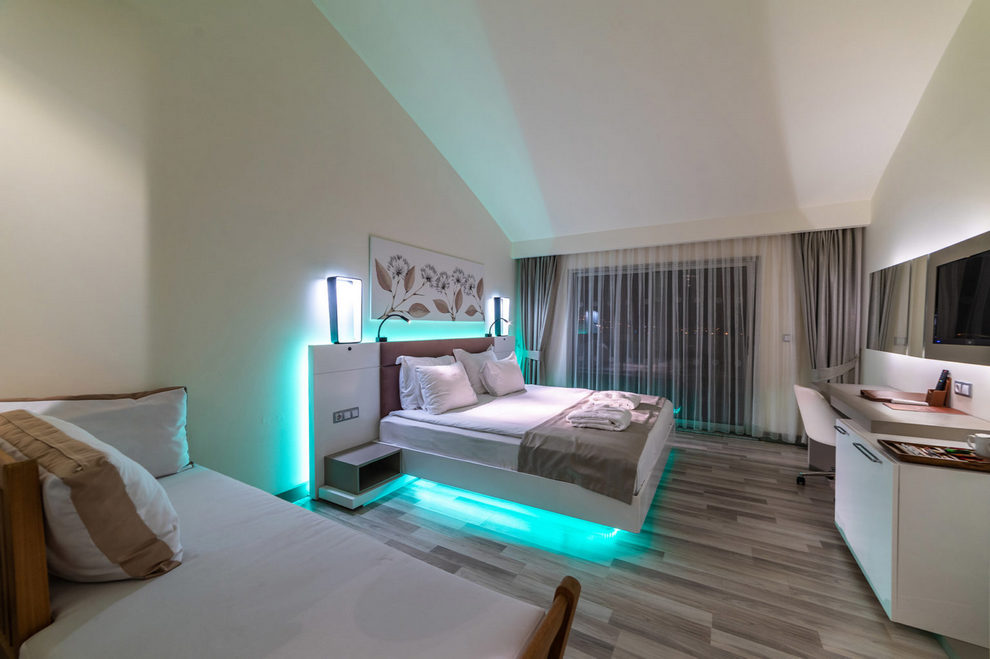 Хотелът се състои от една основна сграда (5 етажа, 2 асансьора) и два допълнителни корпуса. В тях са разпределени 256 уникално обзаведени, климатизирани стаи за гости. В основна сграда: 49 Deluxe room land view (29-32 кв.м); 21 Deluxe room sea view (29-32 кв.м); 7 Deluxe superior sea view room (разполага с голяма тераса с кът за отдих - 50 кв.м); 2 Handicapped (пригодени за хора с ограничена подвижност); 43 Family suite side sea view (1 стая със спалня, 1 стая с единични легла, 1 баня- 38-45 кв.м); 12 Family suite land view (1 стая със спалня, 1 стая с единични легла, 1 баня - 38-45 кв.м); 1 Senior Suite (50-90 кв. м), 4 Penthouse Suite (50-90 кв. м). В анекс сграда: 82 Standard Land View Room (23 кв.м); 16 Swim up room (cтаите са с директен достъп до басейна - 23 кв.м. Не се допуска настаняване на деца до 16 г.), 1 Senior Suite (50-90 кв.м). Всички стаи са оборудвани с телевизор, телефон, сет за чай/кафе, минибар (ежедневно зареждане с вода и безалкохолни напитки - безплатно), сейф (безплатно), баня с душ, сешоар, сапун и шампоан, балкон, Wi-Fi (безплатно). Почистване на стаите - всеки ден, смяната на спалното бельо и кърпите - 3 пъти в седмицата.