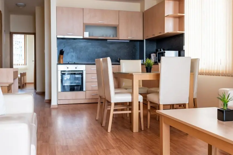 Райската градина се състои от хотел и апартаменти. Хотелът се състои от 48 луксозни двойни стаи, 6 изискано обзаведени апартамента и апартамент-делукс, индивидуално декорирани с елегантност и стил. Всички апартаменти и повечето от стаите предлагат както невероятна морска панорама, така и красива гледка към парковата зеленина. Настаняването в стаите и апартаментите включва закуска в ресторанти Paradiso и безплатно ползване на вътрешен и външен басейн, шезлонги на басейните и подземен паркинг. 800-те апартамента (студиа, апартаменти с една, две и три спални) на Райската градина са оценени с четири звезди според туристическите стандарти. Всички апартаменти са индивидуално климатизирани с напълно оборудвани кухни. Всеки от апартаментите е индивидуално обзаведен и декориран.