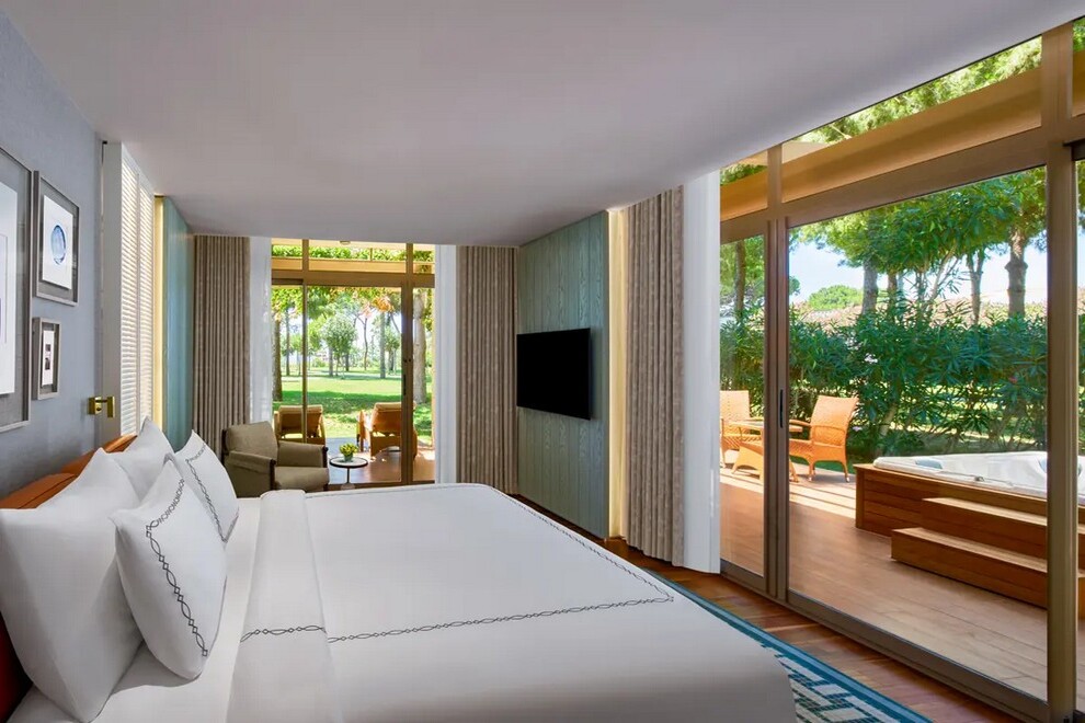 1 Presidential Vila с 6 спални, хол, 2 стаи за персонал, частна професионална кухня, голяма работна стая, СПА зона – фитнес, сауна, парна баня, джакузи, стая за масаж, билярдна зала, киносалон, гардеробна, 7 бани, частна тераса с маса и мека мебел, частен басейн с морска и прясна вода с опции за отопление, хамак, чадъри и шезлонги, сушилник за пране, площ 400 кв.м