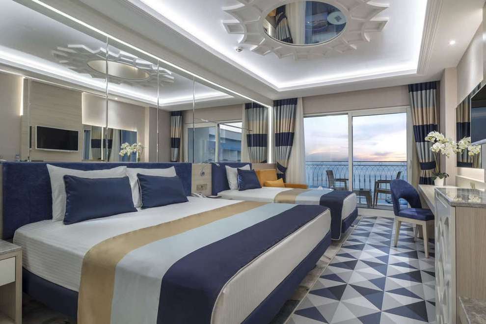Standard Room с изглед море/ страничен изглед към морето/ изглед към сушата, разполага с 1 двойно легло, 1 единично легло и 1 диван, баня с душ, балкон, площ 35 кв.м, максимално настаняване 2+2 или 3+1