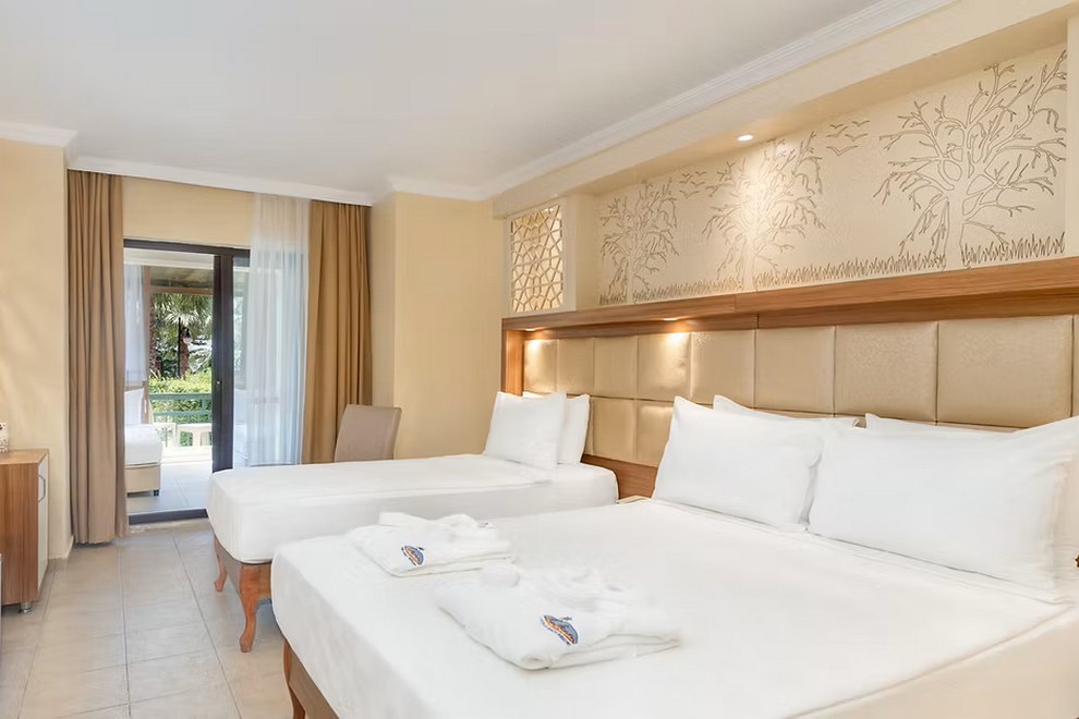 Хотелът се състои от дванадесет 3-етажни корпуса, в които са разпределени 354 климатизирани стаи, от които: