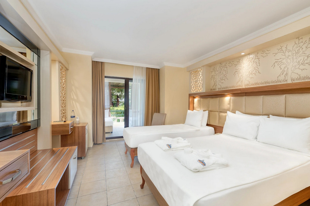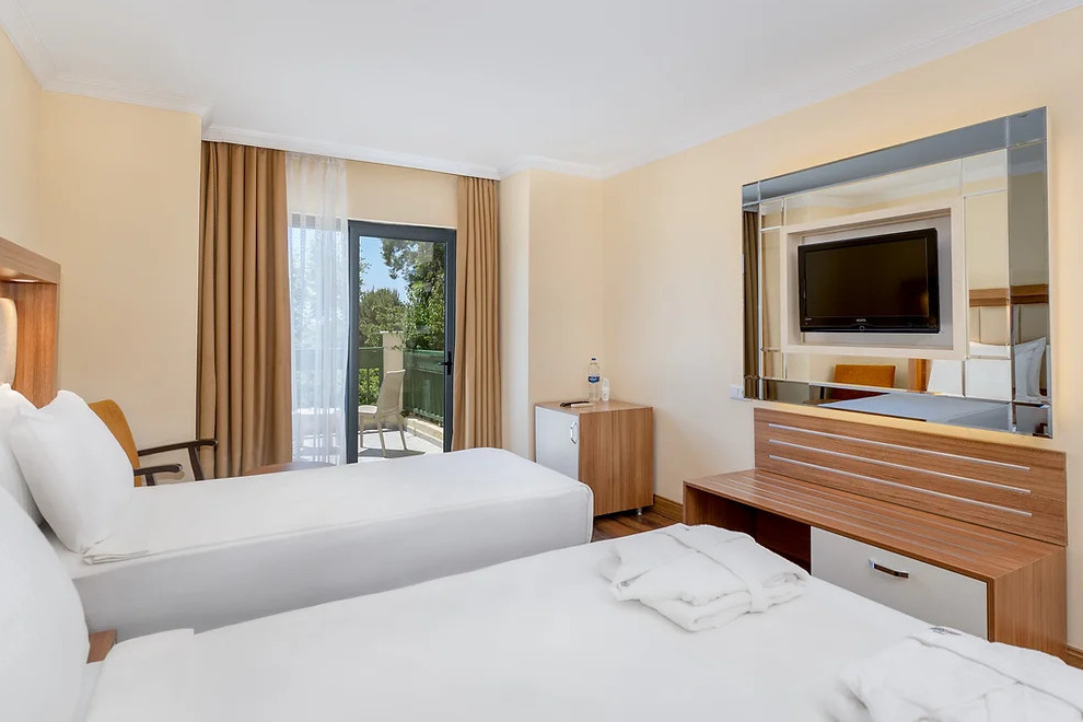 Хотелът се състои от дванадесет 3-етажни корпуса, в които са разпределени 354 климатизирани стаи. Те са обзаведени с телефон, сателитна телевизия, минибар (ежедневно зареждане с вода), сейф (безплатно), баня с душ, сешоар, балкон. Стаите се почистват всеки ден, смяна на спалното бельо - 3 пъти седмично.