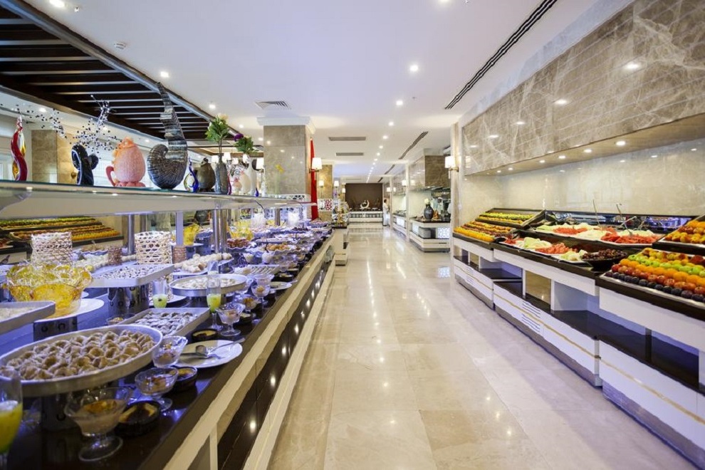 На разположение на гостите има оcновен ресторант Citrine и 2 а`ла карт ресторанта: турски и италиански. Освежаващи напитки и закуски се поднасят Сладкарница Sapphire, снек ресторант Karmir, бар на плажа Pearl, снек бар Quartz, бар Diamond, бар Aquamarine, ирландски пъб Jade.