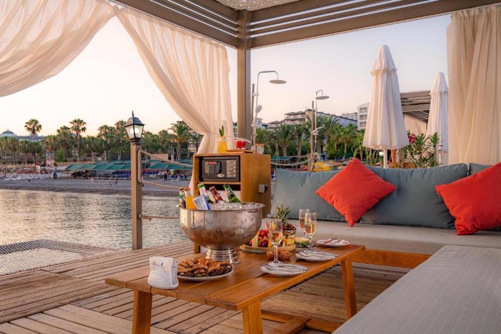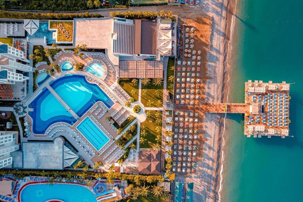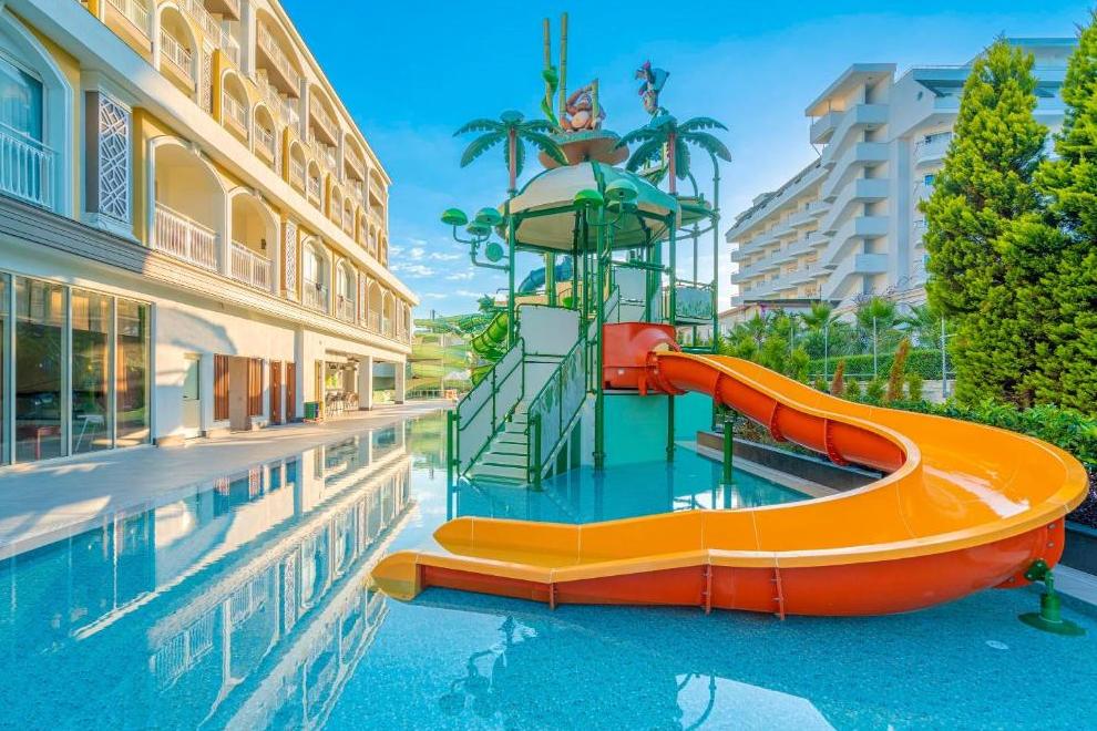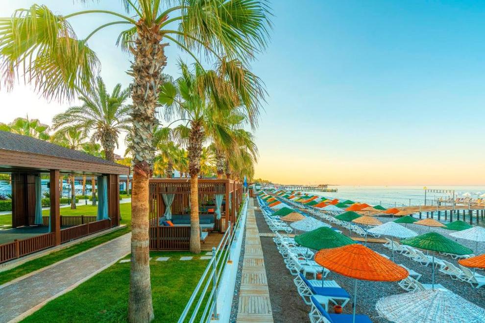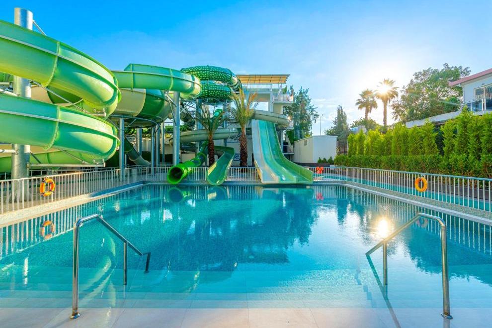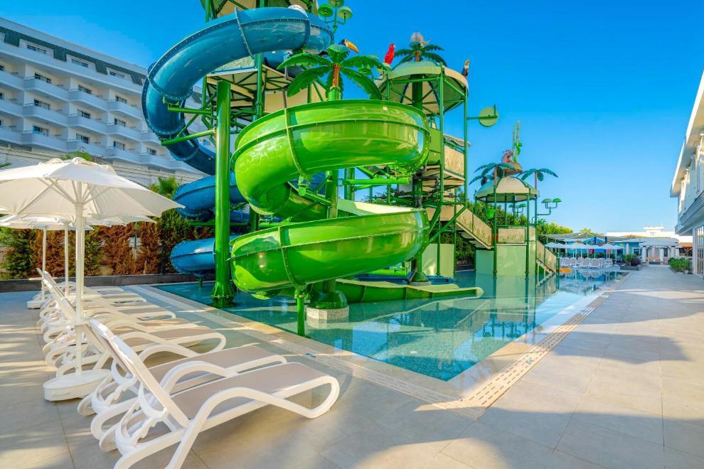 Собствен пясъчно-чакълест плаж, дълъг 200 м. Разполага с открит басейн, закрит басейн, 3 водни пързалки. Чадъри, матраци, шезлонги, плажни хавлии с ползват безплатно. Кабаните на плажа и кея - срещу заплащане.