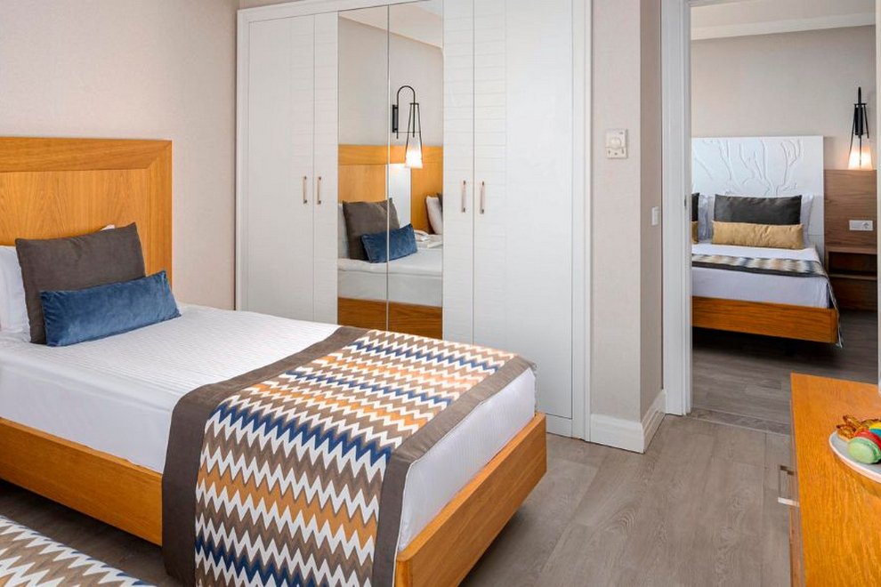 18 Family Room - 1 двойно и 2 единични легла,две стаи със свързваща врата, една баня с душ, балкон, площ 39 кв.м, максимално настаняване 4+1+1 (бебе).