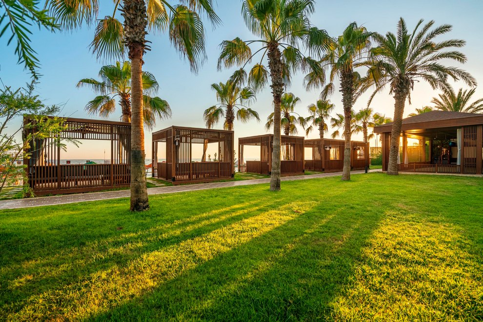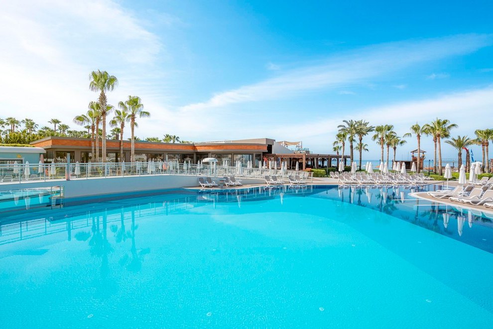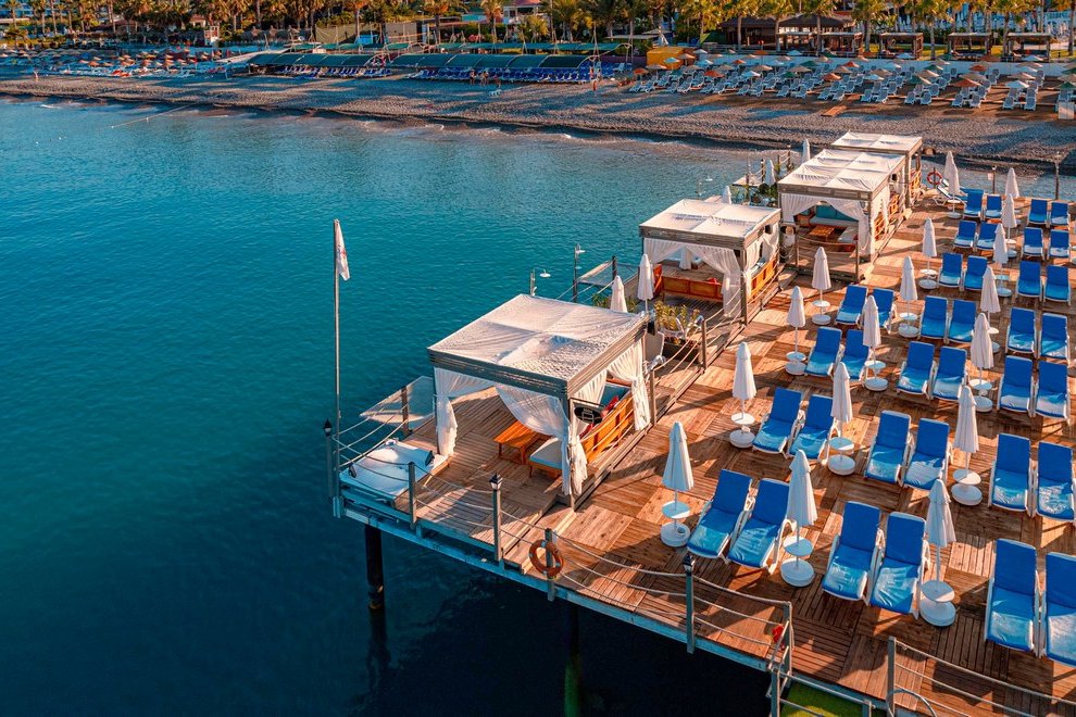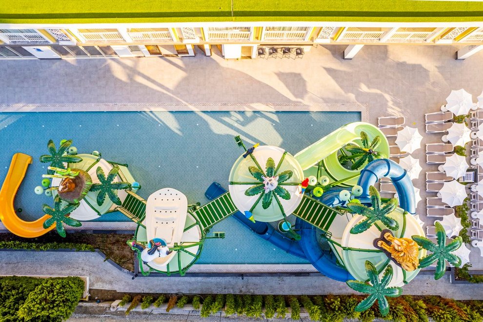 Собствен пясъчно-чакълест плаж, дълъг 200 м. Разполага с открит басейн, закрит басейн, 3 водни пързалки. Чадъри, матраци, шезлонги, плажни хавлии с ползват безплатно. Кабаните на плажа и кея - срещу заплащане.