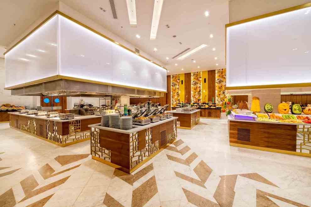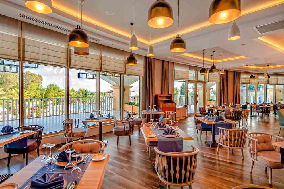 Хотелът разполага с основен ресторант и 4 а`ла карт ресторанта: Mozaik ресторант - средиземноморска кухня и рибен, османски ресторант, Sushi ресторант, Стек хаус ресторант. Освежаващи напитки и закуски се поднасят в 9 бара: Mocca Bar (работи денонощно), лоби бар, бар на плажа, бар при басейна, Бар у Fruit, Бар Mixology, бар на кея, Аква бар и диско бар.