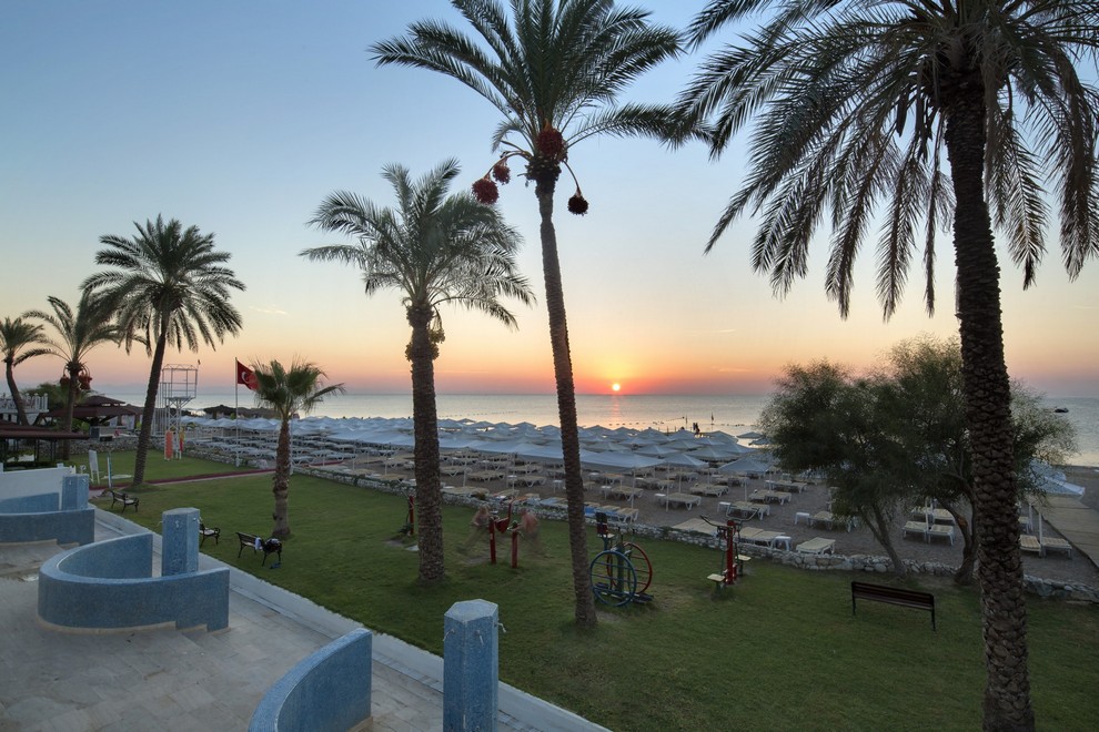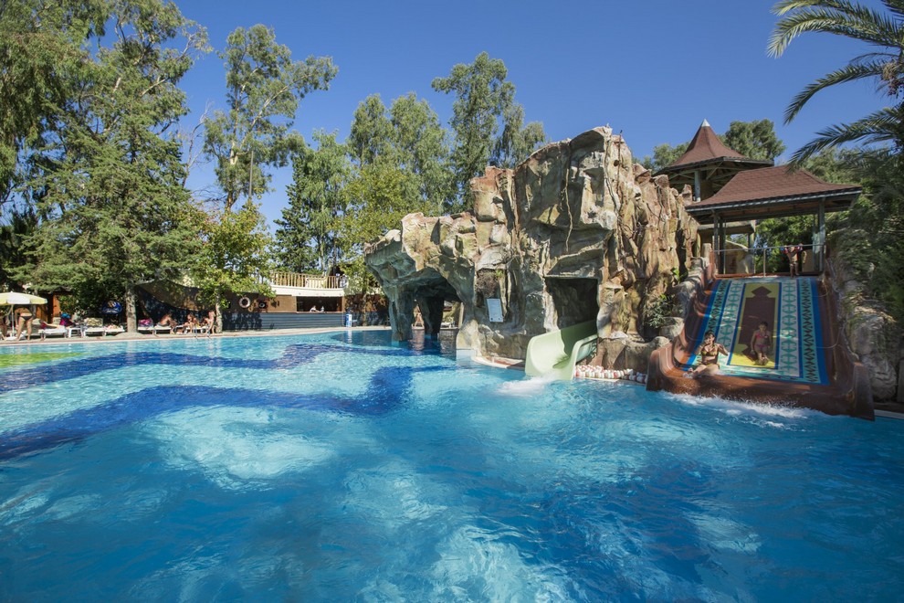 Хотелът има собствен чакълест плаж и един открит басейн с две водни пързалки.