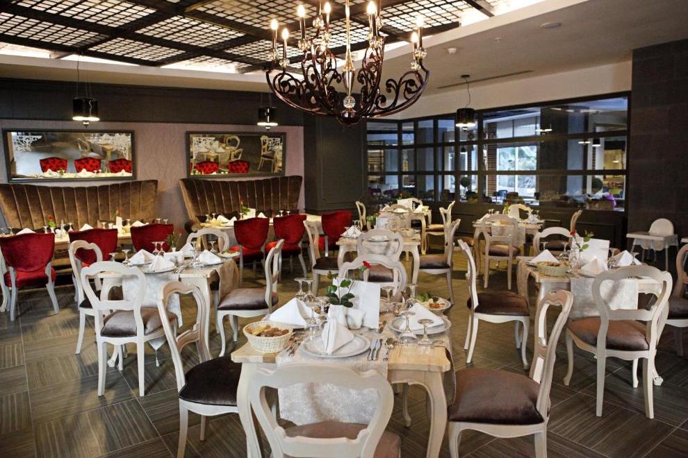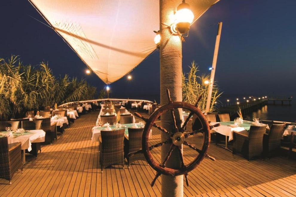 Основен ресторант, 5 а`ла карт ресторанта (по предварително записване - безплатно веднъж по време на престоя). Китайска, турска, италианска кухня и рибен ресторант, 5 бара. Хранене Ultra All Inclusive – закуска, обяд, вечеря и междинни хранения на шведска маса, местни и някои вносни алкохолни и безалкохолни напитки без лимит.