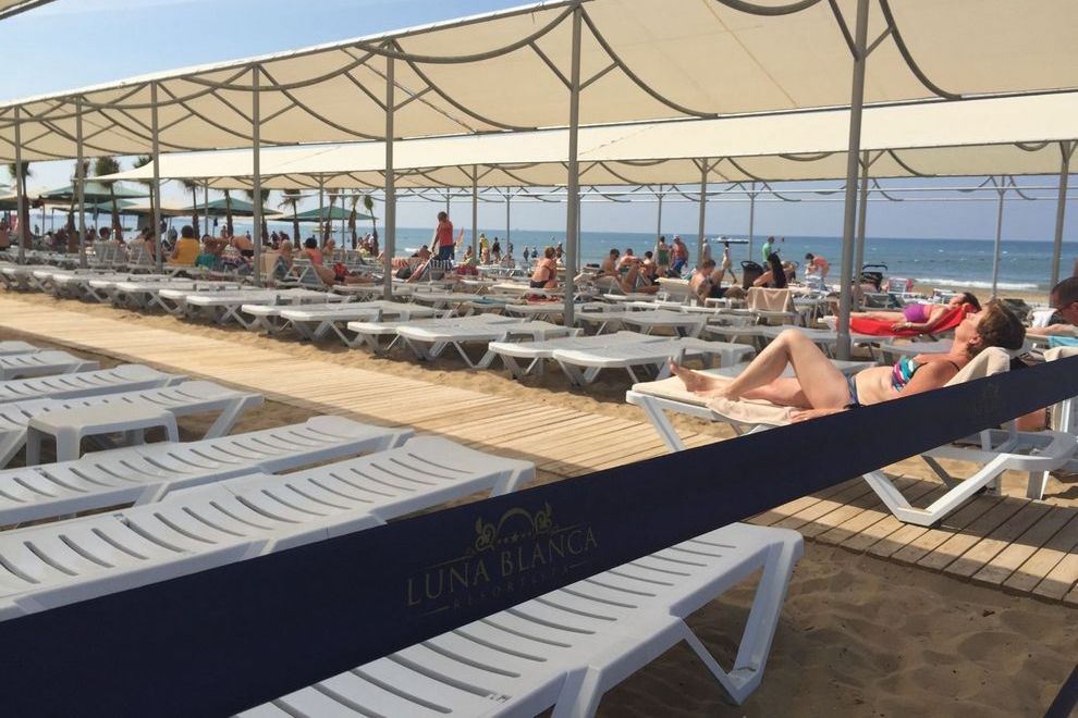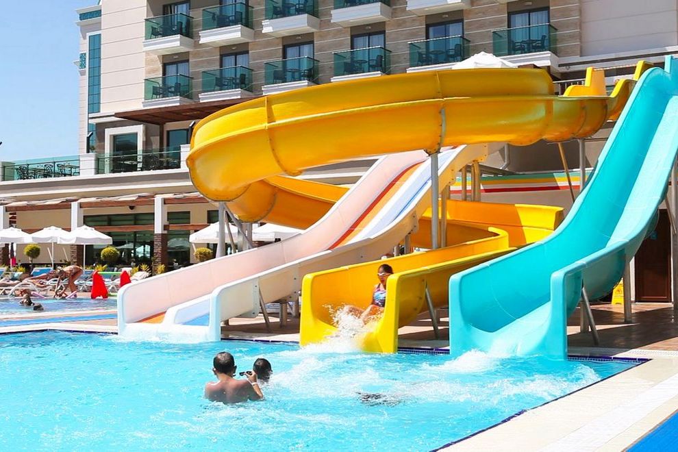 Собствен пясъчен плаж на 300 м от хотела. 2 открити басейна, без отопление, 382 кв.м. и 325 кв.м. 1 вътрешен басейн, отопляем (от 1/11 до 31/03), 80 кв.м. 3 водни пързалки, работно време 10:00-12:00 ч. / 14:00-16:00 ч.