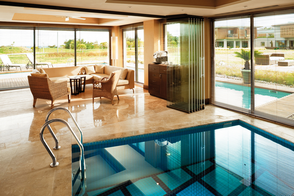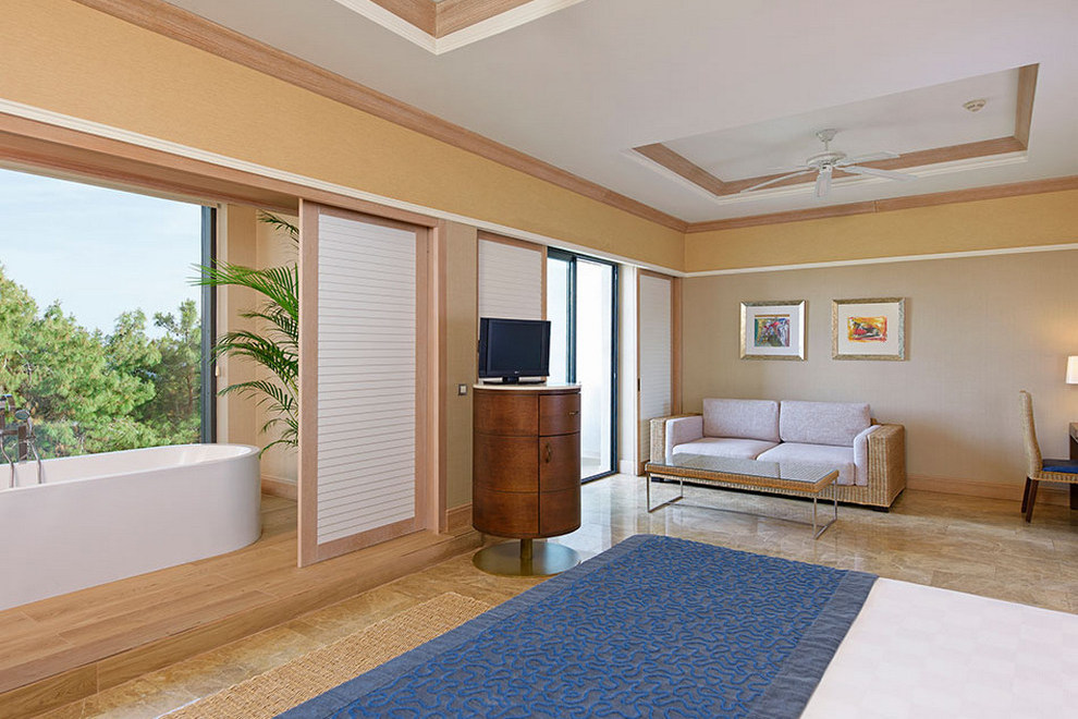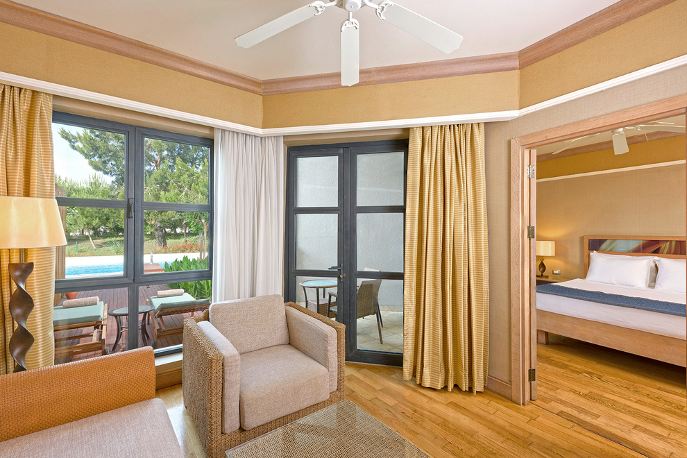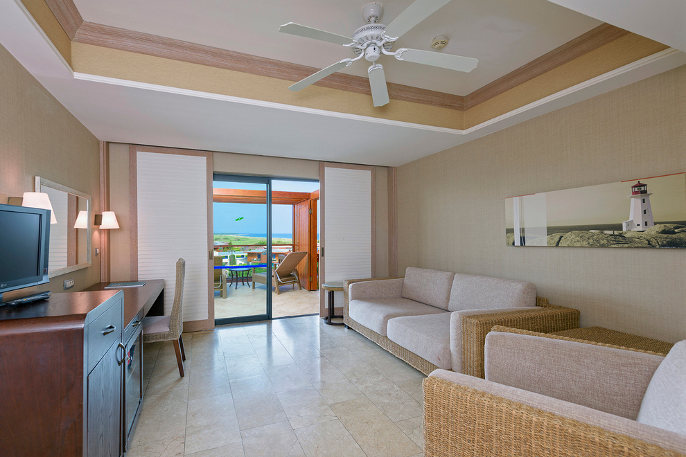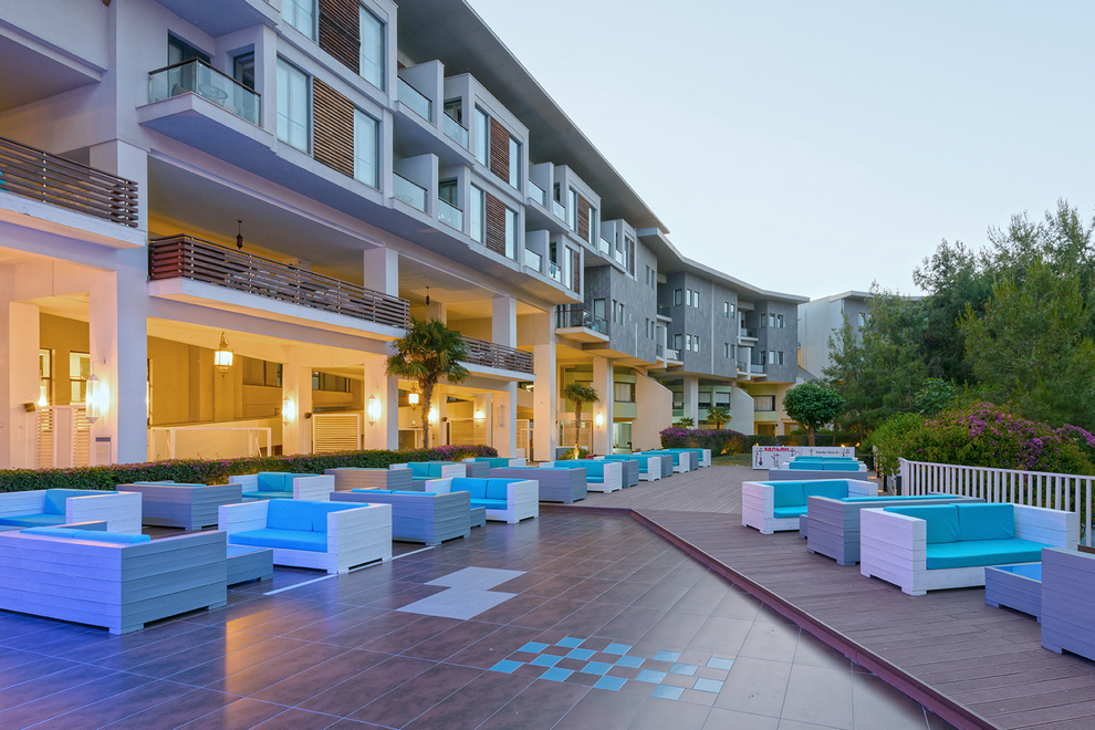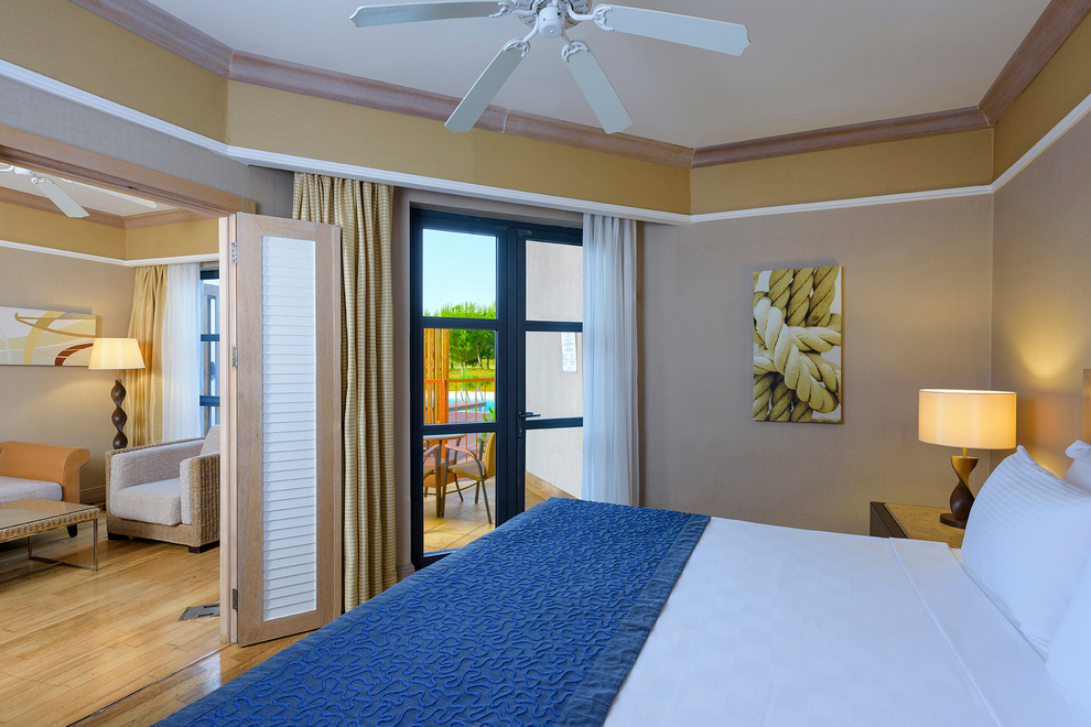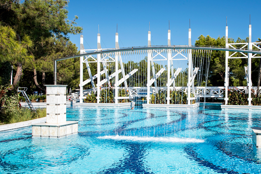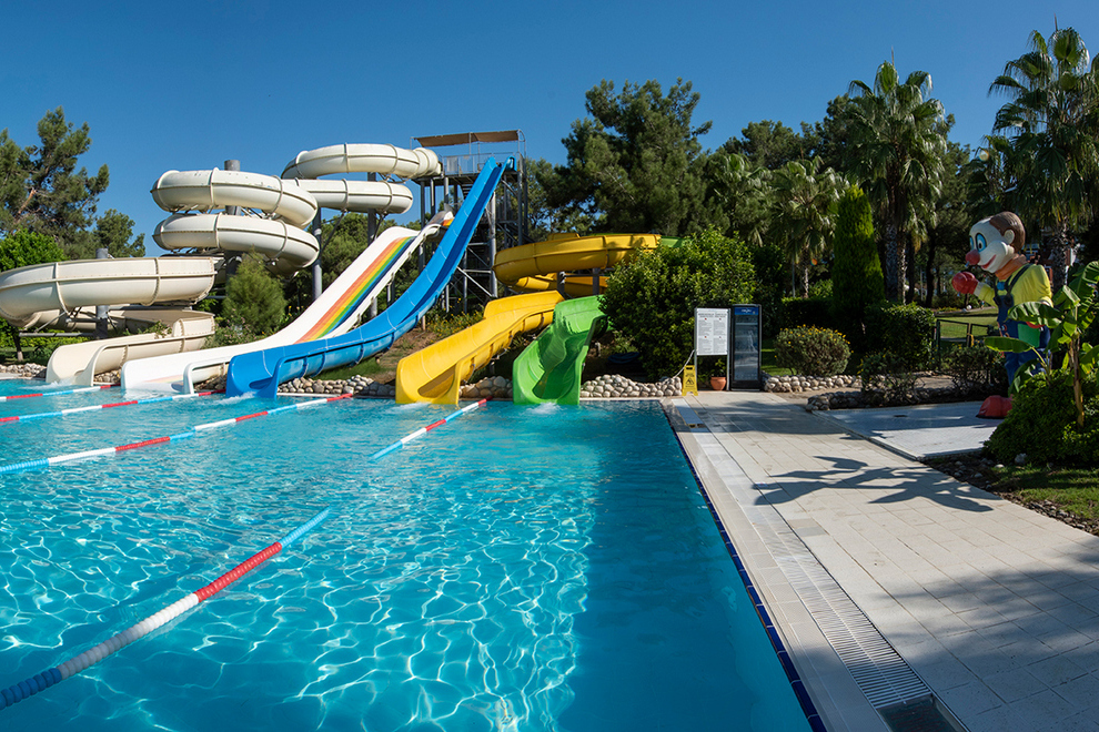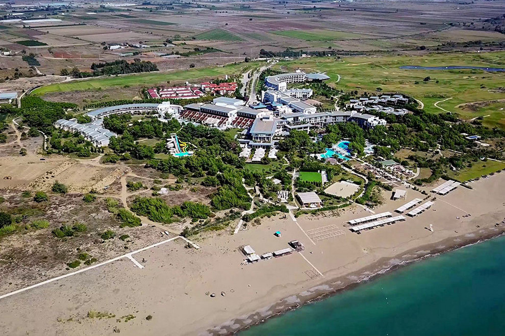 Собственият пясъчно-чакълест плаж на хотела е с дължина 2,5 км. Част от плажа в близост до хотела е предназначен за гости на хотела, останалата част е естествено местообитание за костенурки (карета). Павилионите на плажа се предлагат срещу заплащане, точната цена се определя на място. На разположение на гостите има 6 открити басейна с прясна вода (без отопление). 1 вътрешен басейн със сладка вода (отворен и отопляем през зимния сезон): 165 кв.м, 5 водни пързалки, работно време 10:00-12:00 / 14:00-16:00 ч. Всички открити басейни са отворени от 1/04 до 31/10 в зависимост от сезона и метеорологичните условия.
