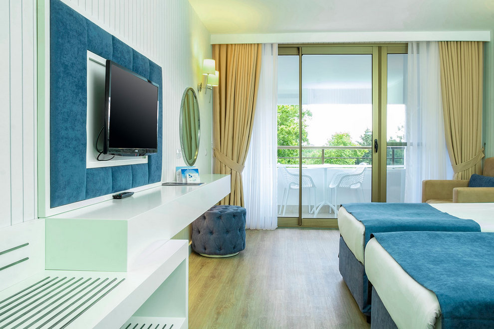 260 метра дълъг пясъчно-чакълест плаж, награден със Син флаг. 4 открити басейна, закрит басейн (лятото работи като открит басейн), 3 водни пързалки. Бар на плажа. Чадъри, шезлонги, матраци – безплатно. Плажни хавлии: безплатно. На басейна: чадъри, шезлонги, матраци – безплатно.