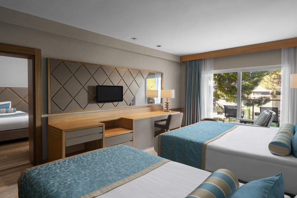 Family Room, разположени в основната хотелска сграда, идеални за семейства до шест души, с двойна спалня и двойна тоалетна/душ, максимално настаняван 4+2, площ 58 кв.м,