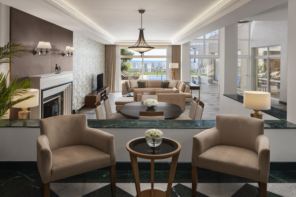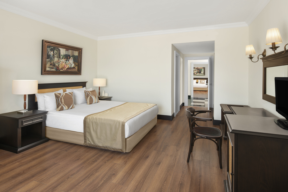 King Suite, проектиран за големи семейства, апартаментът с двойно легло King Suite разполага с две спални и елегантно декорирана всекидневна, максимално настаняване 5 човка, площ 128 кв.м
