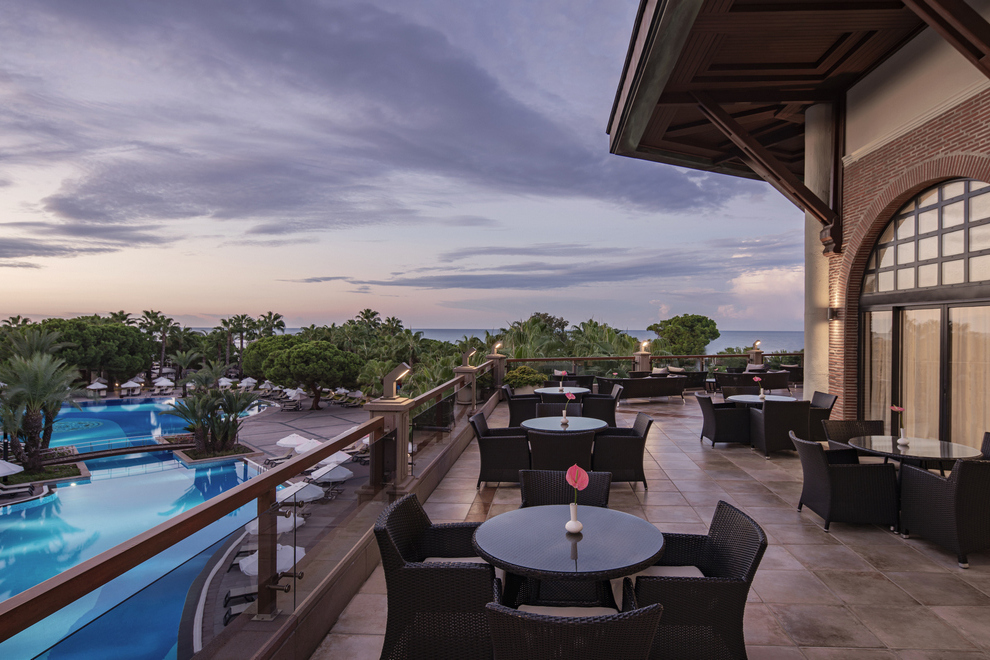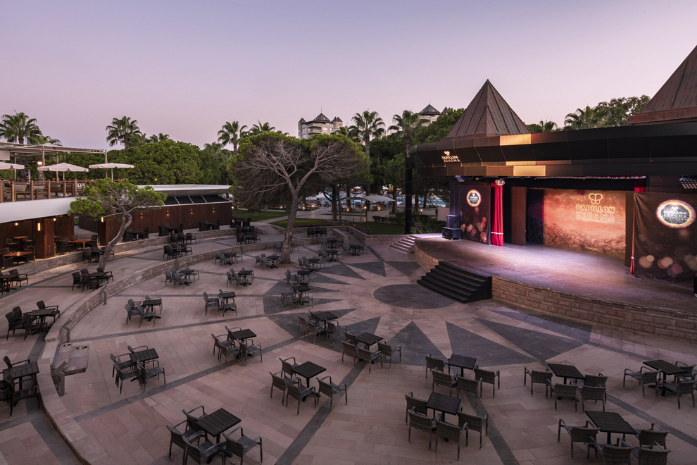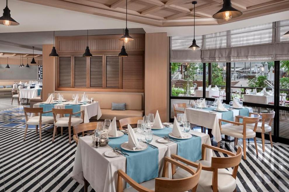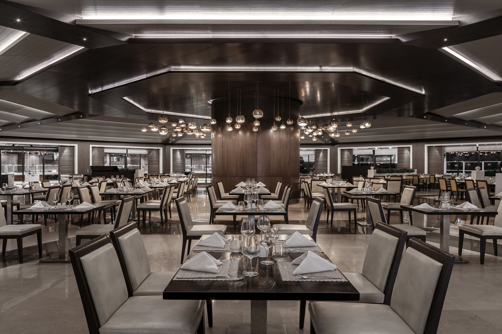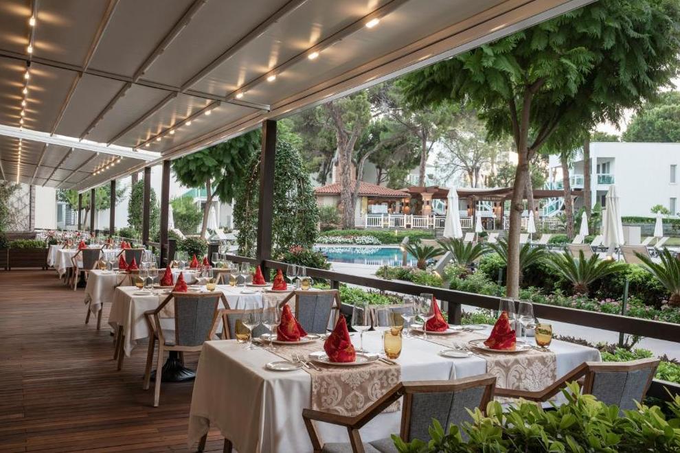 На разположение на гостите са основен ресторант, предлагащ вегетарианско меню, и 4 a`лa карт ресторанта: средиземноморски, китайски, интернационален, турски (с предварително записване, за времето на престоя, едно посещение във всеки ресторант – безплатно) Разнооразни напитки и закуски се предлагат в 7 бара (един от тях е отворенднонощно).