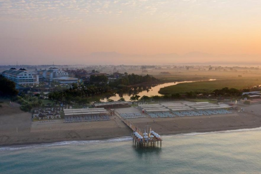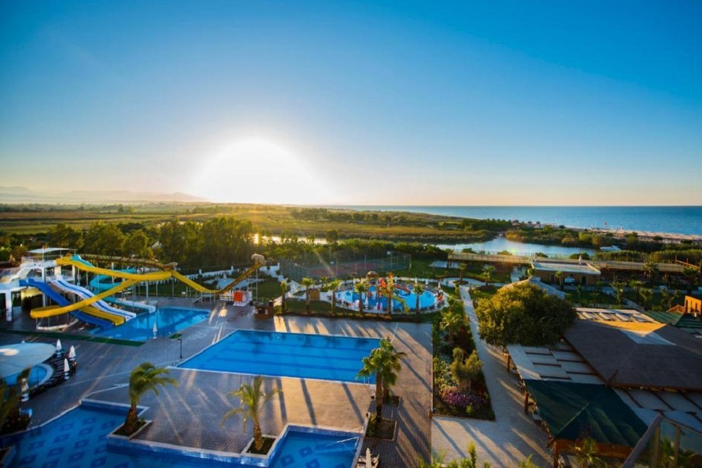 Собствен пясъчен плаж и 2 открити басейна, детски басейн и аквапарк с водни пързалки.