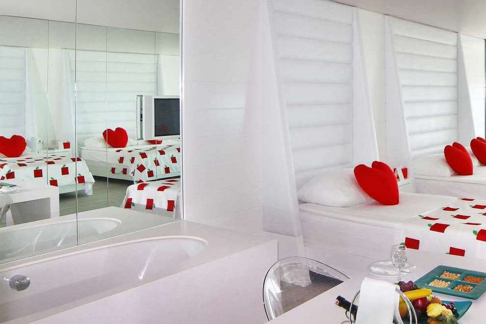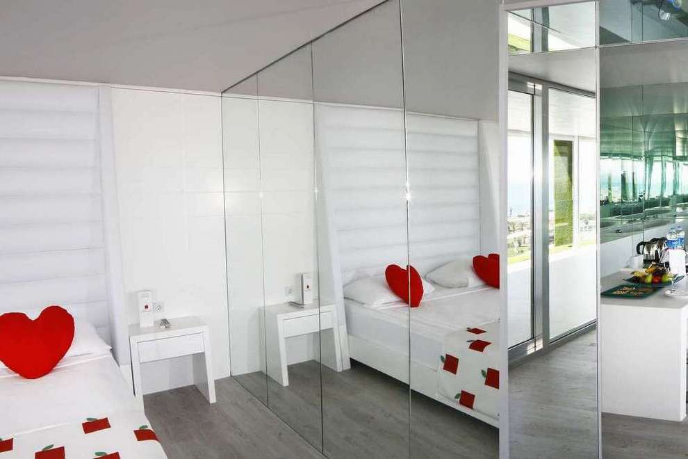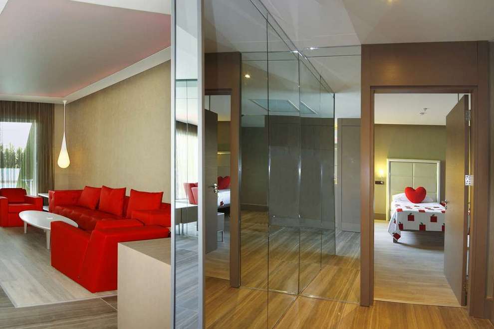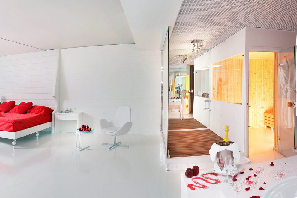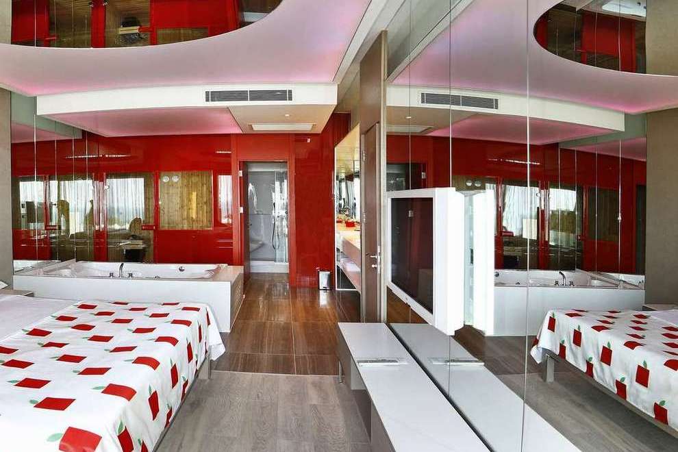 Всички стаи са оборудвани с дизайнерски мебели, червено осветление, климатик, телевизор, телефон, сет за кафе/чай, минибар (безплатен), сейф (безплатен), максибар (платен), светещо огледало за гримиране, терапевтично легло на терасата, баня с душ/вана + парна баня, сешоар, халат (при поискване), чехли, джакузи (без стаите за инвалиди), .