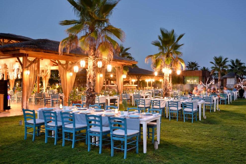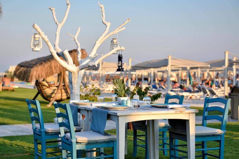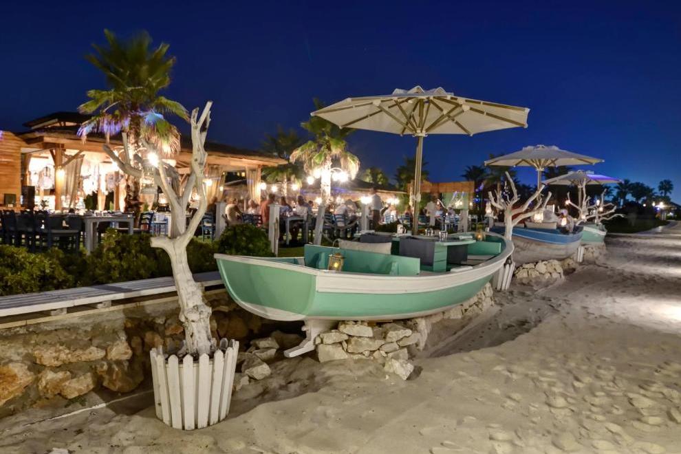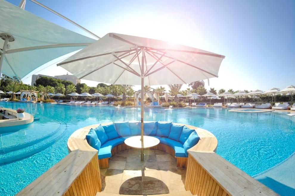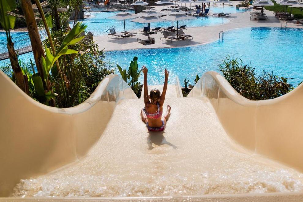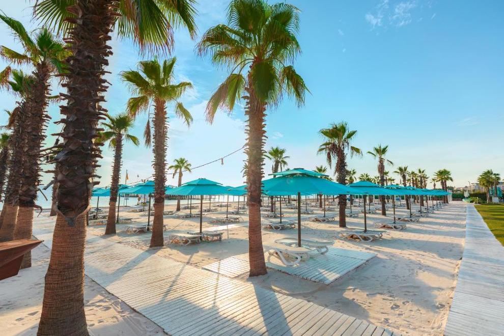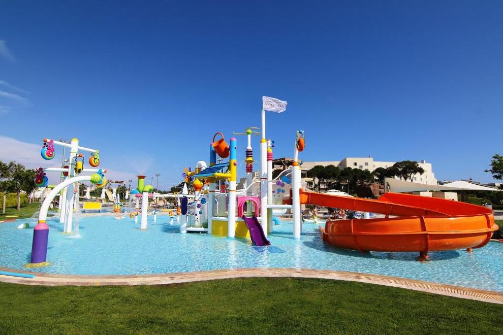Собствен пясъчен плаж, дълъг 320 м, награден със сртификат "Син флаг", и кей 1800 кв.м. За удобство на гостите предлага 6 открити басейна (1 басейн с изкуствени вълни, басейн 16+ и отопляем басейн през зимния период) и закрит басейн (отопляем през зимния сезон). Чадъри, шезлонги, плажни кърпи и матраци на плажа и при басейна се предоставят безплатно.