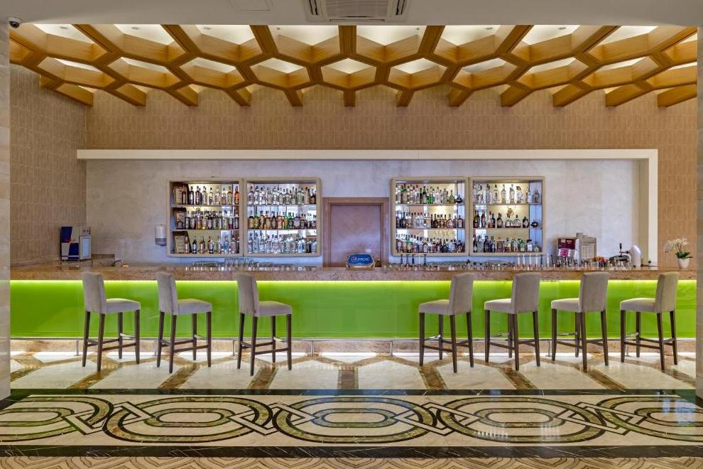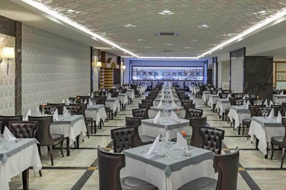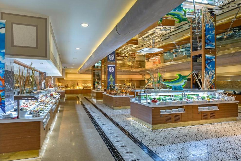 На разположение на гостите има основен ресторант Palace, детски ресторант Bambino, Palace бистро и сладкарница. Има 6 а`ла карт ресторанта: италиански Vapiano (18:30-21:30 ч.); азиатски Hashi (18:30-21:30 ч.); турски Lal (18:30-21:30 ч.); морски Deep Blue (18:30-21:30 ч.); мексикански El Torito (18:30-21:30 ч.) и японски Teppanyaki (18:30-21:30 ч.), необходима е предварителна резервация. Освежаващи напитки и закуски се поднасят в Pera лоби бар (денонощно), Piano лоби бар (17:00-00:00 ч.), бар при басейна (10:00-00:00 ч.), бар на кея (09:30-18:00 ч.), бар на терасата (17:00-00:00 ч.), Turquoise снек бар (10:00-16:30 ч.), Amphi (10:00-21:30 ч.), Oxygen диско бар (23:45-02:30 ч.) и боулинг бар (16:30-00:00 ч.). Ultra All Inclusive - закуска, обяд и вечеря, междинни хранения, алкохолни и безалкохолни напитки - без лимит (съгласно концепцията на хотела).