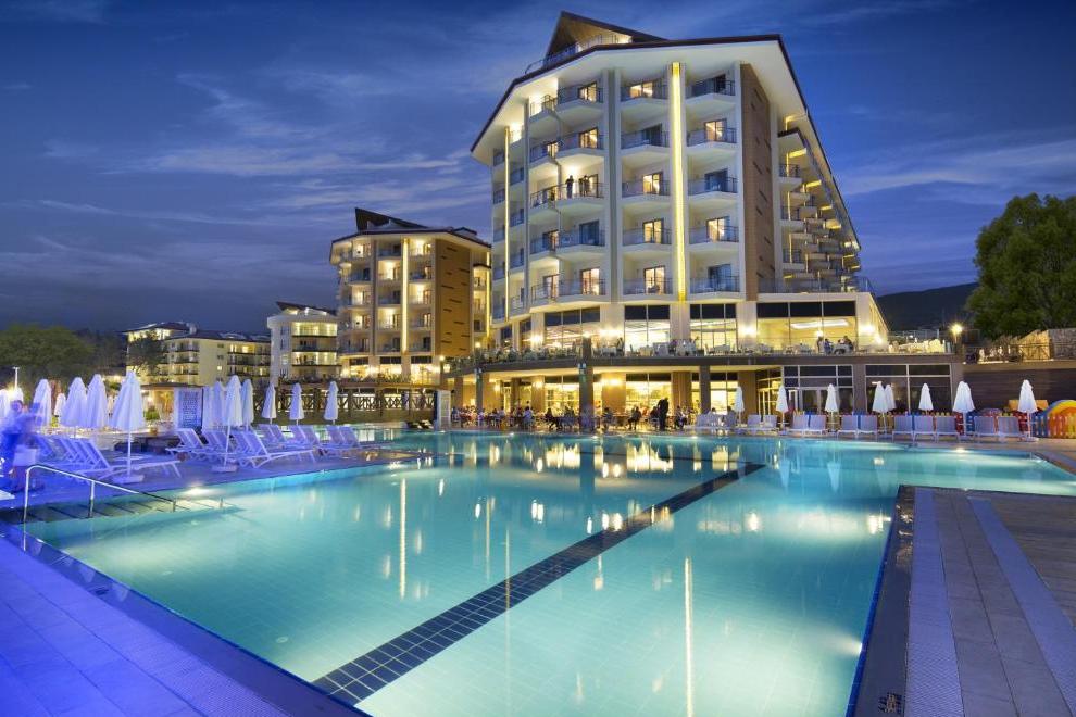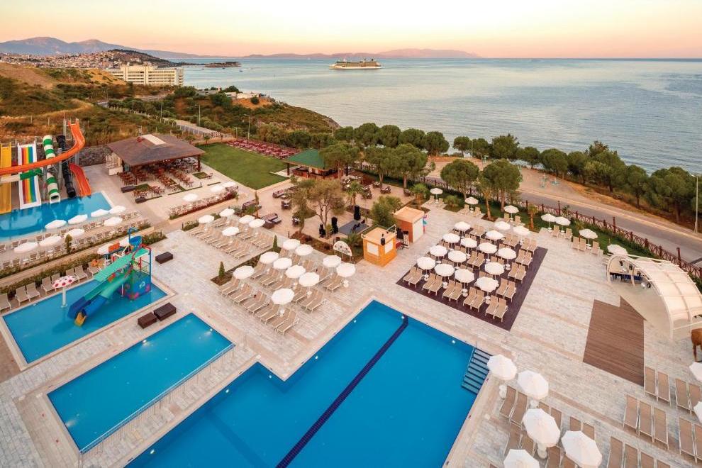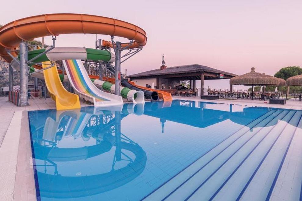 Хотелът се намира на 2 км от собствен пясъчно-чакълест плаж, осигурен е безплатен шатъл до плажа на всеки час от 10:00 до 16:00 часа в периода от 1 май до 30 октомври. Барът на плажа предлага безплатни безалкохолни напитки, бира и закуски. 4 открити басейна (единият от тях се отоплява през студения сезон). Предлага също основен басейн (617 кв.м), басейн с джакузи (380 кв.м), закрит басейн (78 кв.м), детски басейн (63 кв.м), аквапарк за възрастни и аквапарк за деца с водни пързалки и допълнителни 2 басейна. Чадъри, шезлонги, матраци и плажни кърпи на басейна и на плажа се предоставят безплатно. Осигурен е безплатен транспорт до плажа.