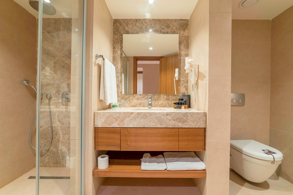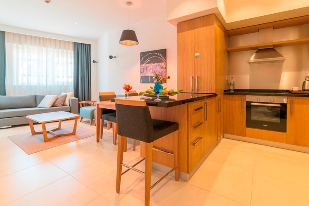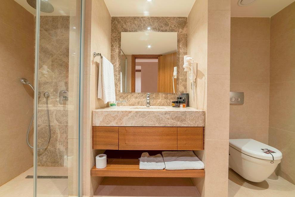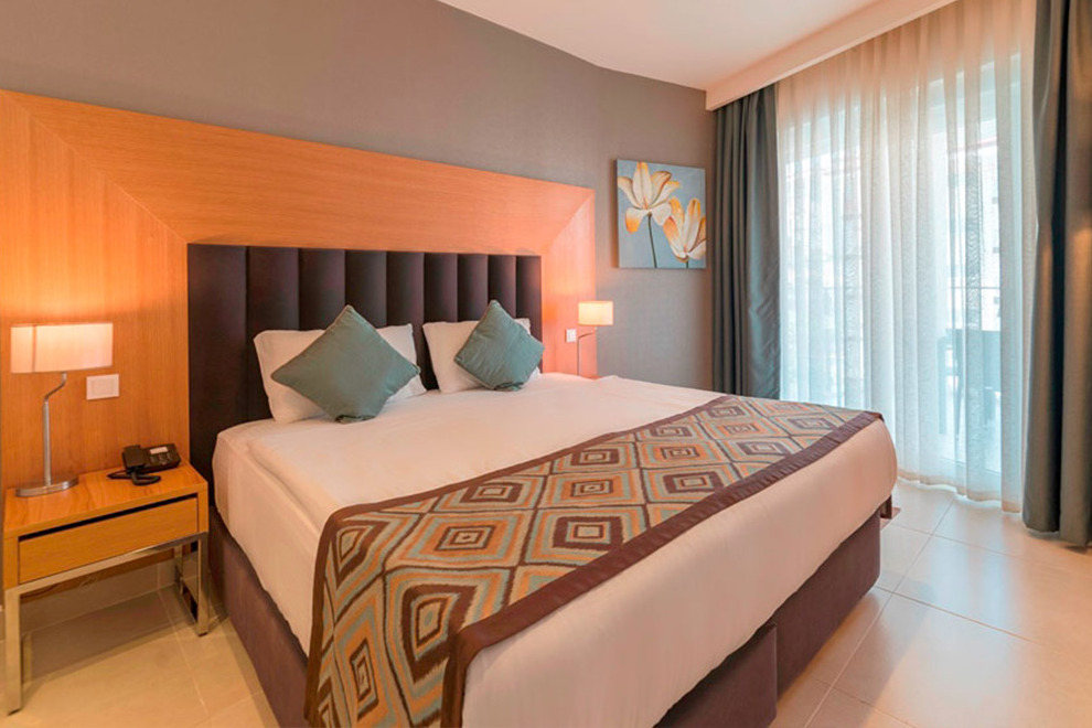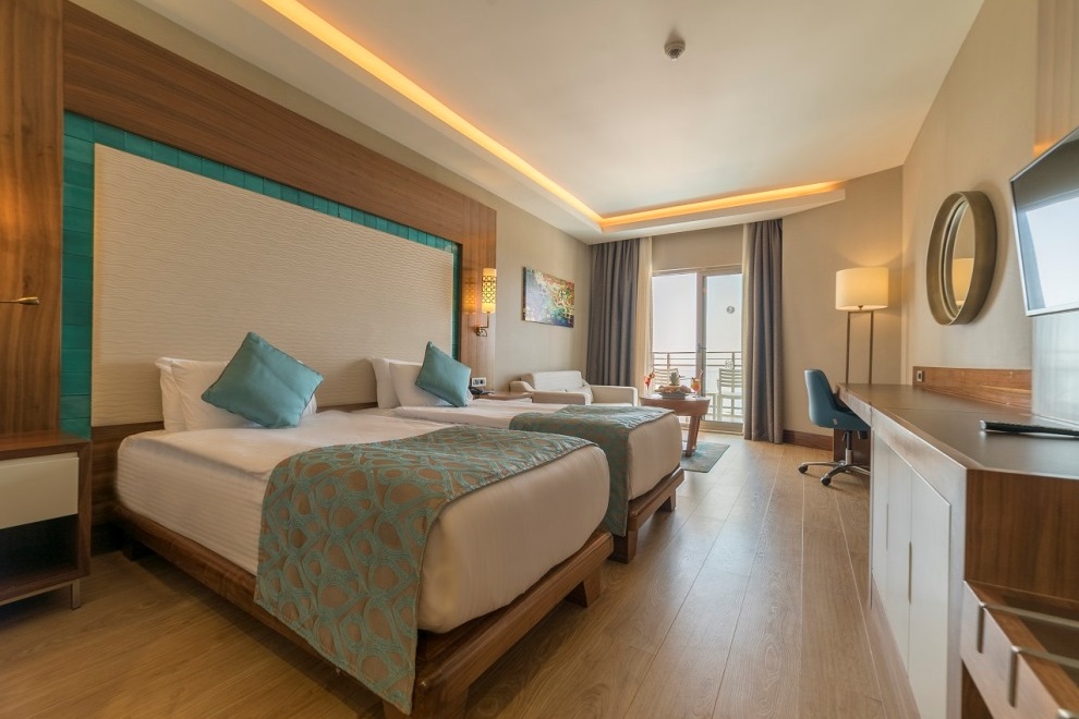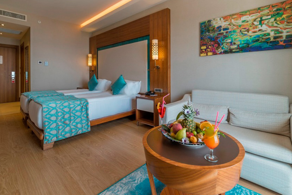 Хотелът се състои от четири сгради, в които са разпределени 443 климатизирани стаи, от които 288 Superior Room (34 кв.м), 63 Junior Suite Room (1 спалня, хол - 53 кв.м), 91 Family Suite Room (2 спални, хол, 2 бани - 71 кв.м) и 2 Handicapped (пригодени за хора с ограничена подвижност).Всички стаи са оборудвани с телевизор, телефон, сет за чай/кафе, минибар (безплатно еднократно зареждане с вода и безалкохолни напитки при настаняване), сейф (безплатен), баня с душ, сешоар, безплатни тоалетни принадлежности, балкон, Wi-Fi . Почистване на стаите – всеки ден, смяна на спалното бельо – 3 пъти в седмицата, смяна на на кърпите – 2 пъти в седмицата.
