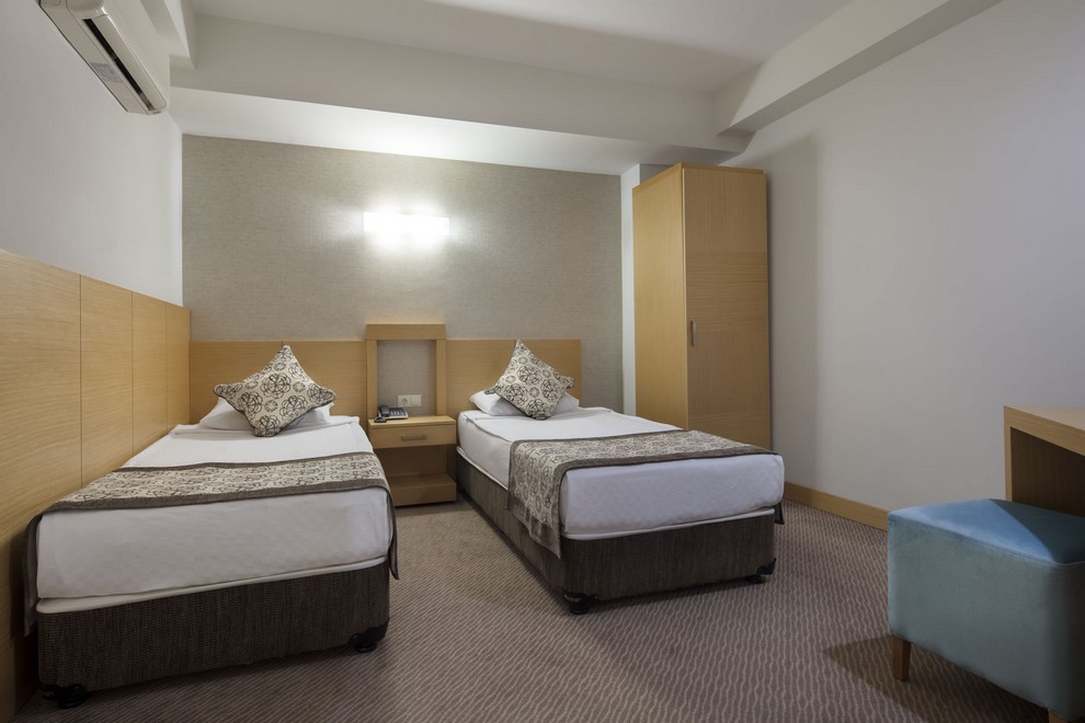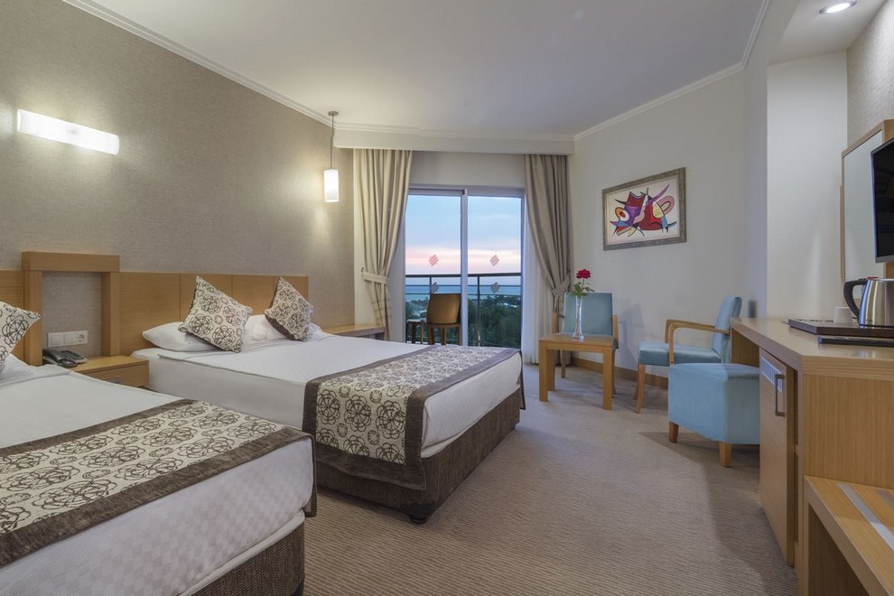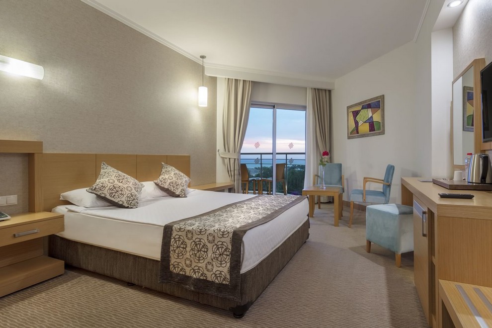 Състои се от един 6-етажен корпус (297 стаи с директен или частичен изглед към морето): 307 standard room (макс. 2+2 чов., 27 м2), от които 4 стаи за непушачи и 3 стаи за инвалиди; 17 двустайни family connected room (2 спални с врата, баня, макс. 3+1 чов., 35 м2); 6 двустайни suite room (с изглед към морето, 2 спални с врата, баня, макс. 4+1 чов., 43 м2); 3 двустайни honeymoon suite (хол, спалня без врата, джакузи, макс. 2+1 чов., 47 м2). В стоите има баня с вана/душ, сешоар, централен климатик, плазмен телевизор, телефон, минибар (при настаняване е зареден с безалкохолни напитки, безплатно), сейф (в стаите, срещу заплащане), под – мокет, балкон. Почистване на стаите – ежедневно, смяна на спалното бельо – 3 пъти седмично. Room service (платен).
