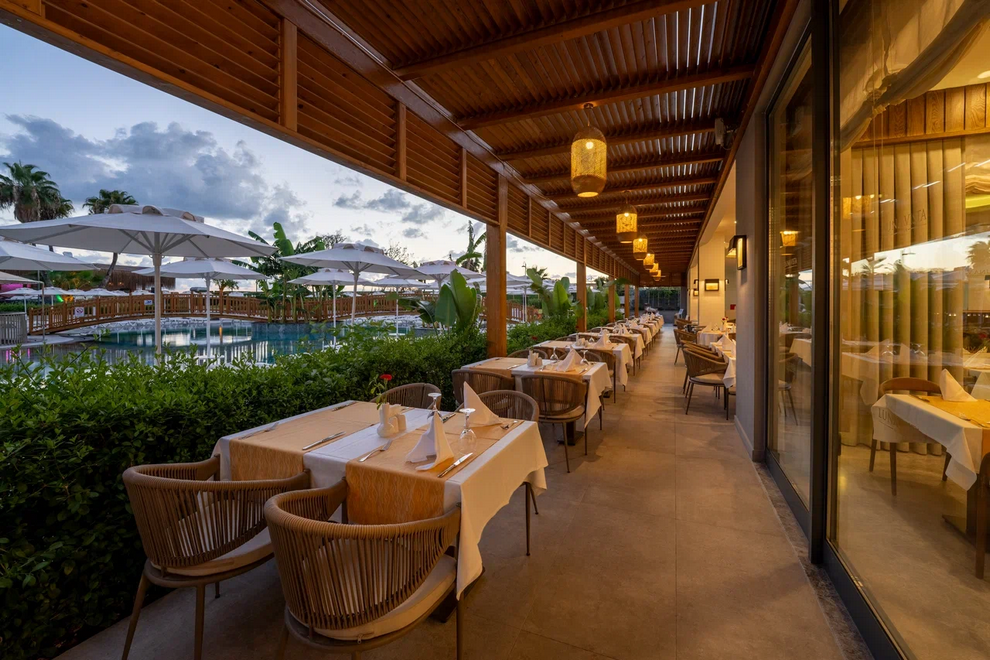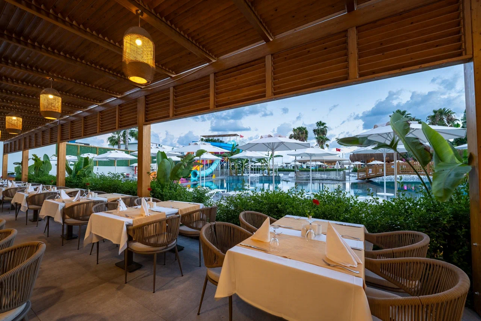 На разположение на гостите е основен ресторант, отворен за закуска, обяд и вечеря, пиде: 12:30 - 16:00 ч. и гьозлеме: 11:00 - 16:00 ч. Предлага се диетично и вегетарианско меню. 2 а`ла карт ресторанта: Karına A'la Carte и Terrace Grace A'la Carte. Освежаващи напитки се предлагат в 4 бара, единият от които работи денонощно, има и кафене.