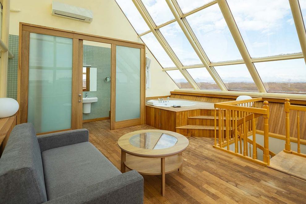 Jacuzzi Suite Rooms с изглед към голф игрището или гледка към сушата, 65-70 кв.м, с просторни зони за ползване на два етажа, свързани с вътрешно стълбище, на горния етаж на стаята има джакузи, разтегателен фотьойл за приятен релакс В спалнята на първия етаж има едно двойно легло или две единични легла, меню с възглавници (5 разновидности), опция за мек вискозен матрак, топли напитки (чай/кафе), ежедневно освежаващ се минибар, електронен сейф, телефон с директно избиране, LCD телевизор, баня с душ, сшоар, Wi-Fi, максимално настаняване 3 възрастни +1 дете.