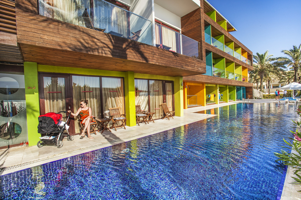 Хотелът разполага със собствен пясъчно-чакълест плаж и платформа. На разположение на гостите са 2 открити и 1 закрит басейн, релакс басейн (всички с прясна вода), 2 водни пързалки, както и с тераса за слънчеви бани. Чадъри, плажни кърпи и шезлонги на плажа и при басейна се ползват безплатно.