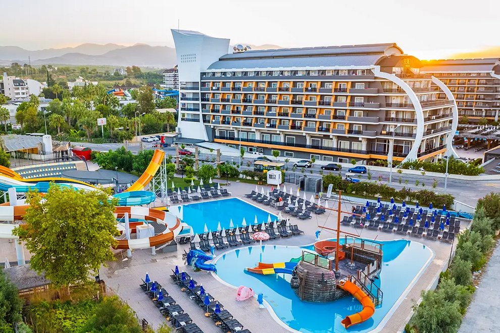 Собствен пясъчно-чакълест плаж на около 400 метра от сградата на хотела (през подлез), осигурен е безплатен шатъл до плажа. Бар на плажа, който работи от 10:00 до 17:00 часа. Открит басейн, два детски басейна, два басейна с водни пързалки за малки и големи. Безплатно ползване на чадъри, шезлонги и матраци на плажа и при басейните.