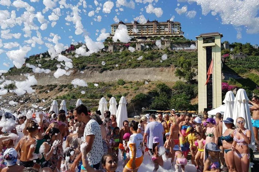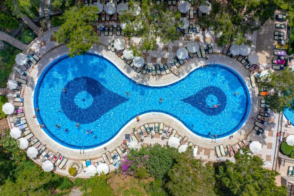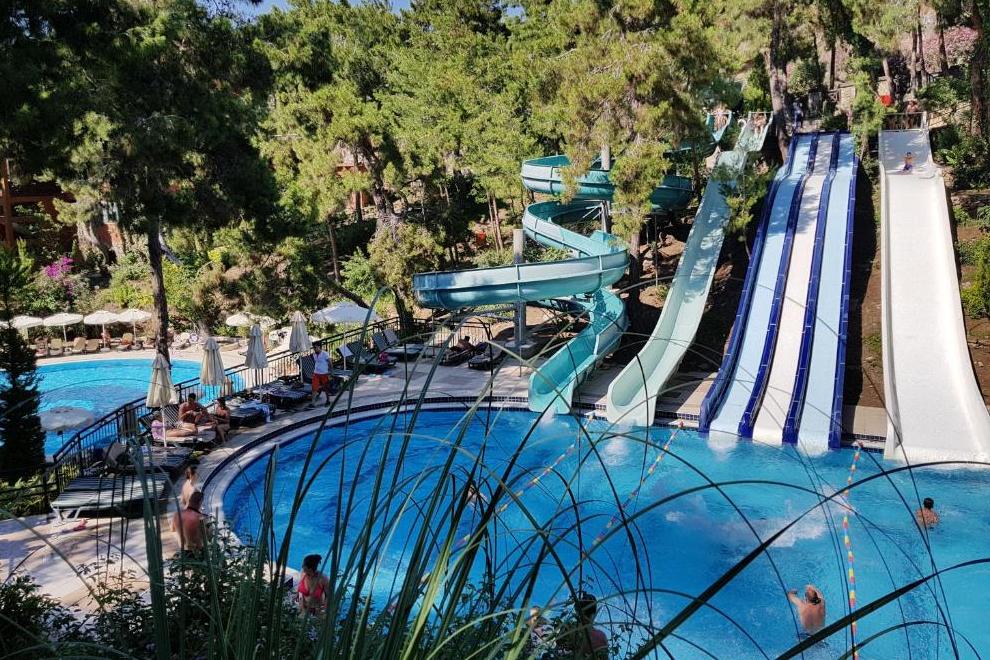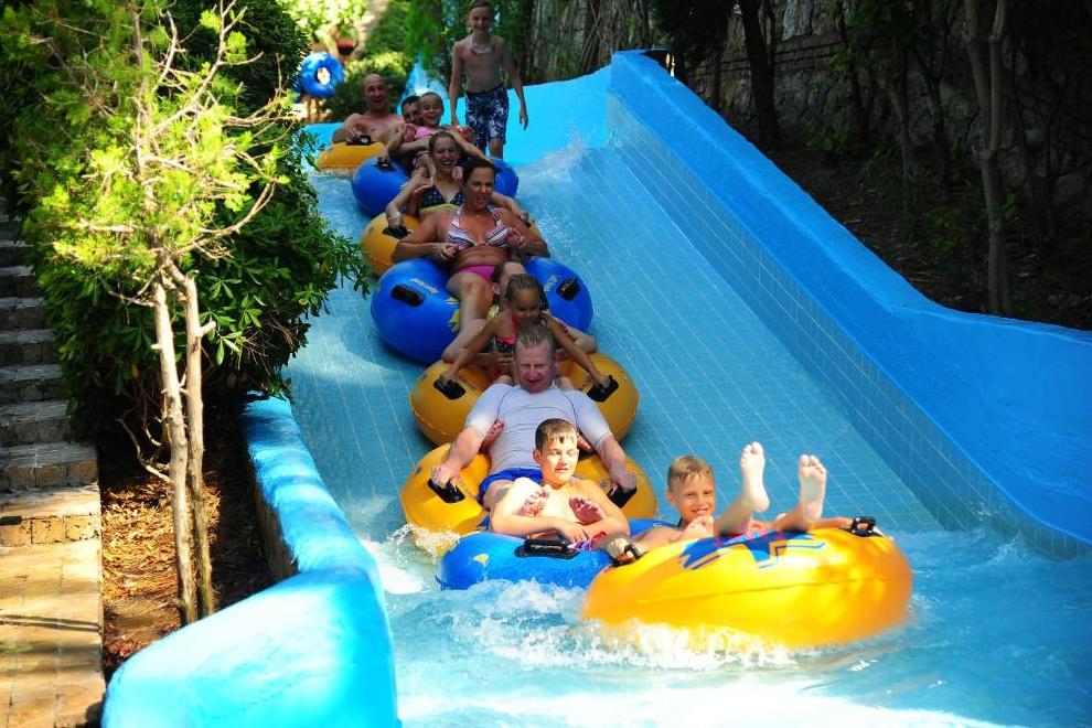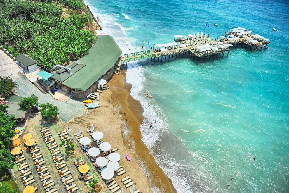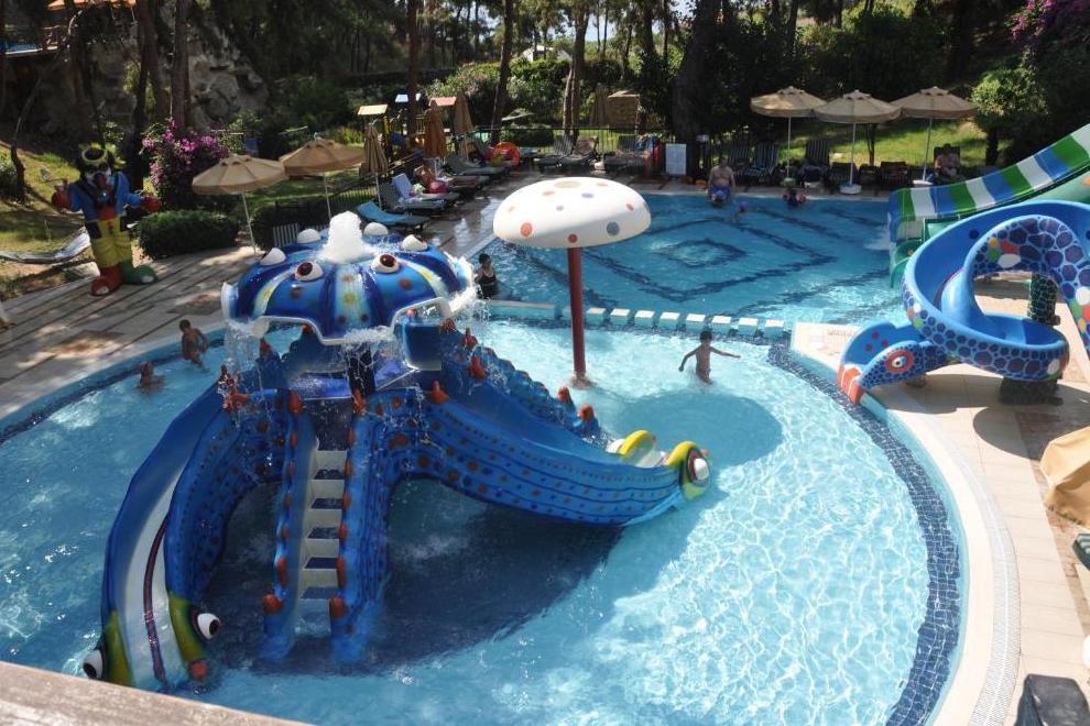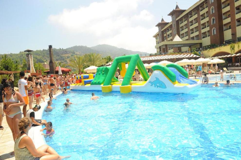 Собствен, пясъчно-чакълест плаж, дълъг 350 м, удостоен със сертификат "Син флаг". Намира се на 150-200 м от хотела, пътят минава по мост. Осигурен е безплатен шатъл до моста на всеки 15 минути, има достъп до плажа с асансьор. На разположение на гостите са 5 открити басейна, вътрешен отопляем басейн, аквапарк с 8 пързалки. Чадъри, шезлонги, плажни кърпи и матраци на плажа и при басейна се ползват безплатно.