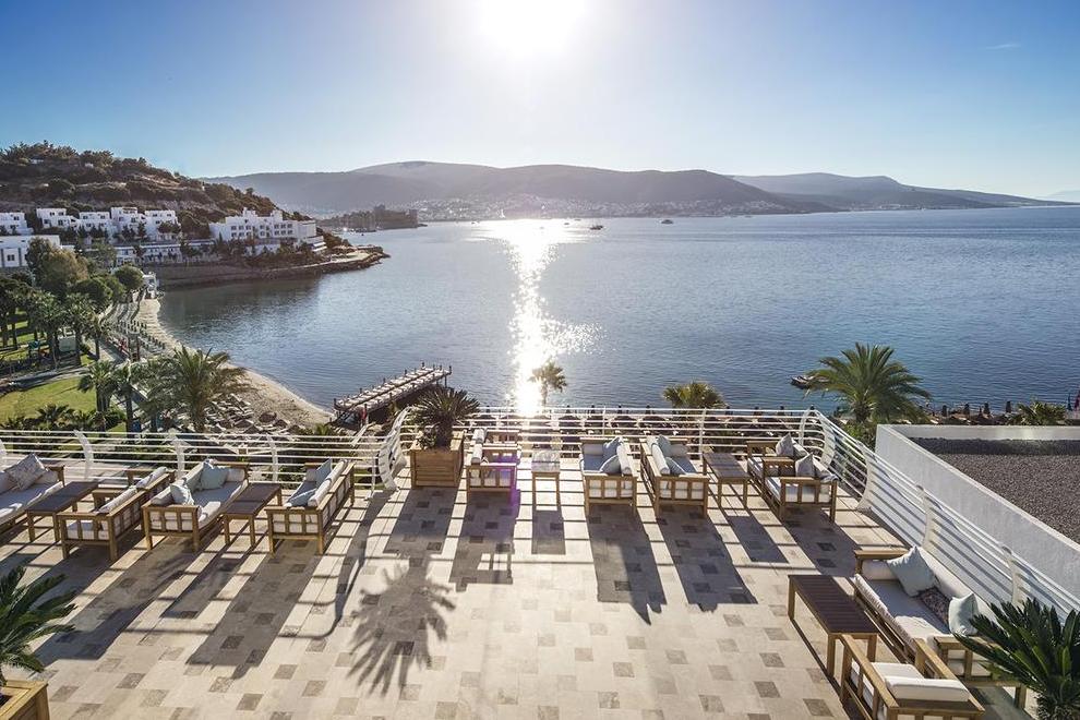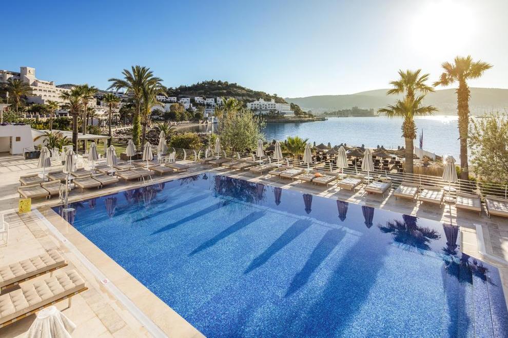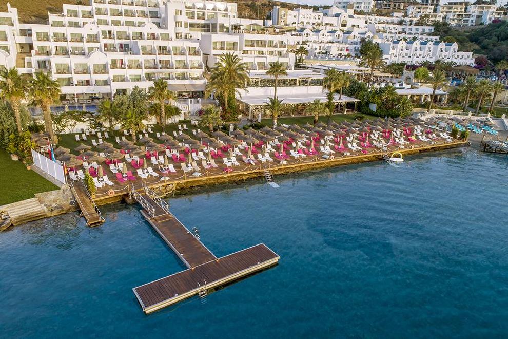 Voyage Bodrum Hotel се намира на собствен пясъчно-чакълест плаж, има и платформа. На разположение на гостите е един открит басейн. Чадъри, шезлонги, матраци и плажни кърпи при басейна и на плажа се предоставят безплатно.