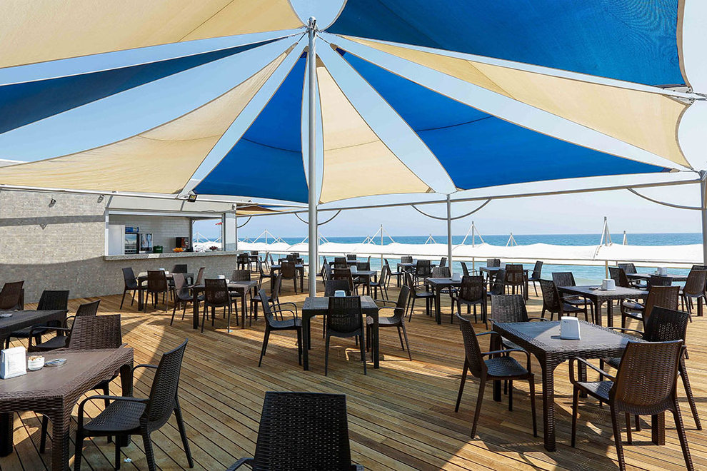 Собствен пясъчно-чакълест плаж, отдалечен на приблизително 250 м от сградата, до който се стига посредством подземен тунел. На разположение на гостите са два външни басейна за възрастни, два външни басейна за деца, два вътрешни басейна (един от които за деца). Чадъри и шезлонги на плажа и при басейна се ползват безплатно. Плажни кърпи – срещу депозит.