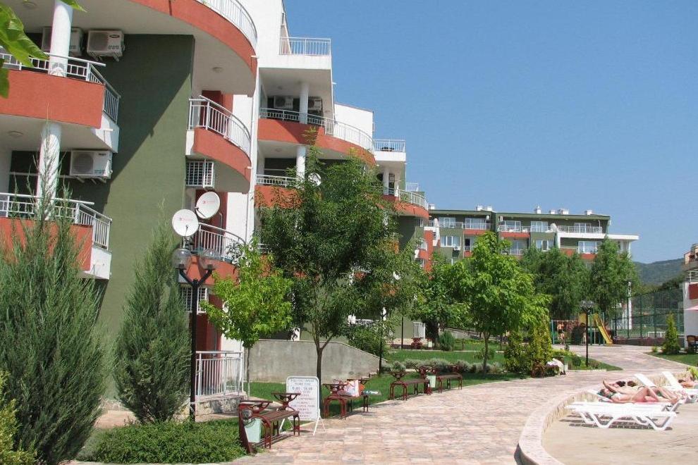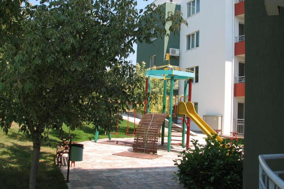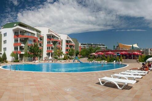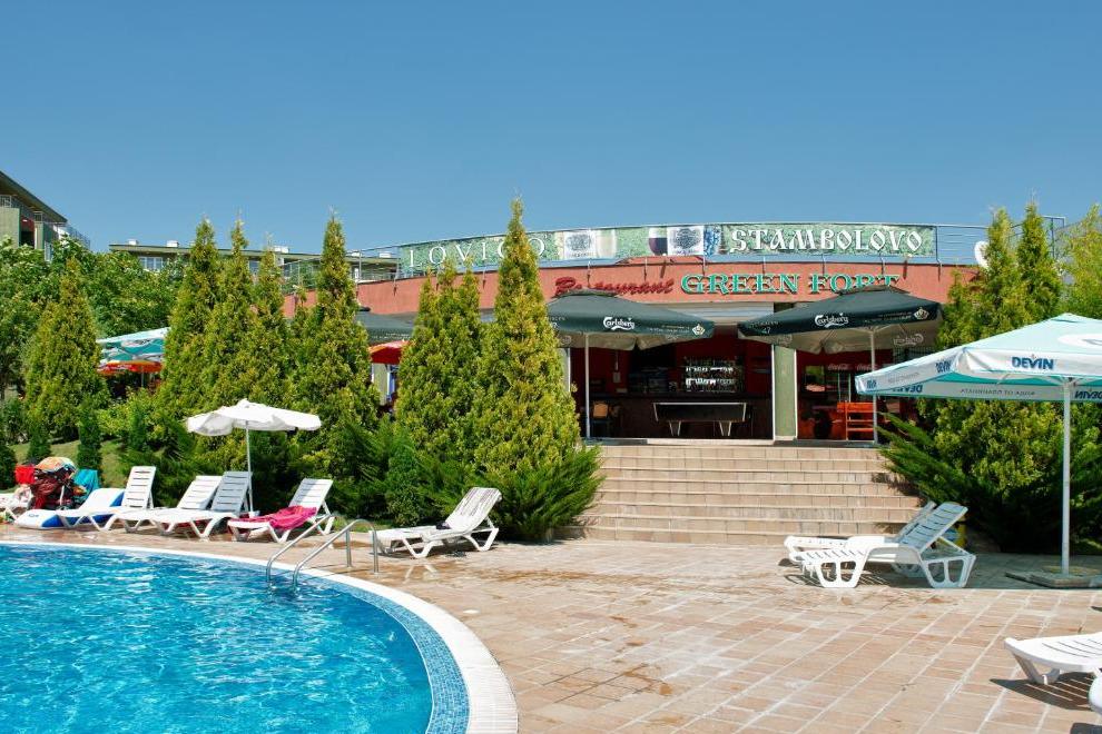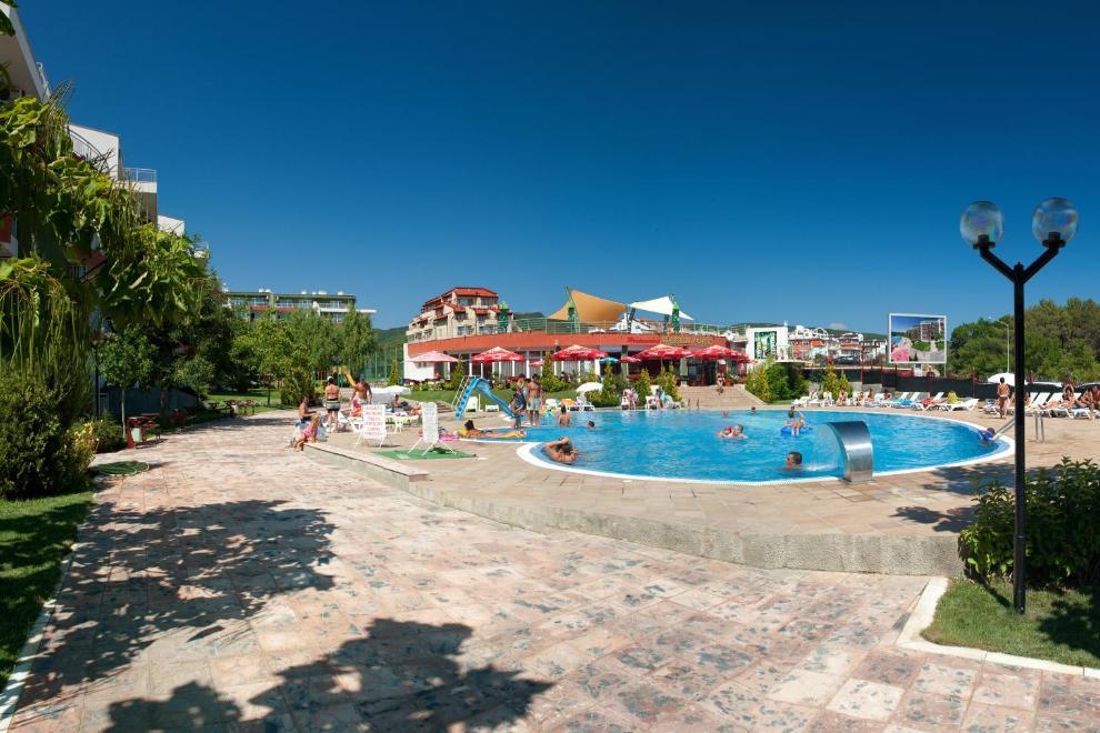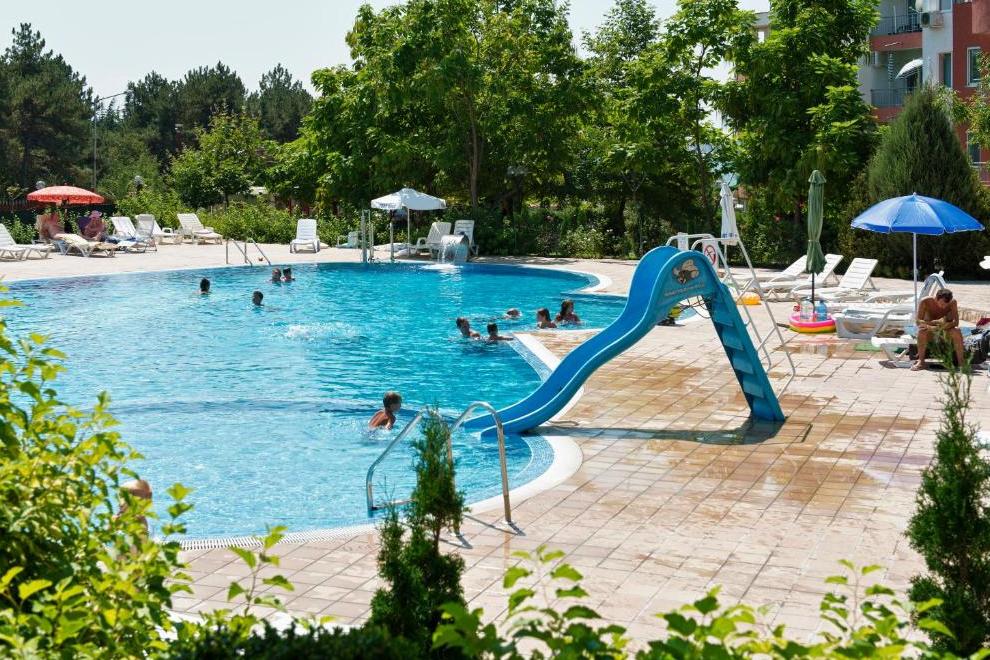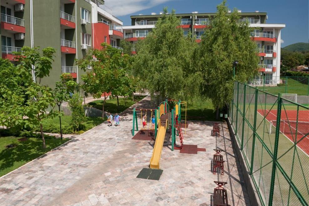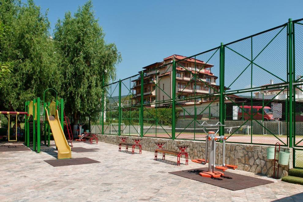 Открит тенис корт, футболно игрище, басейн с пързалка и детска площадка.
