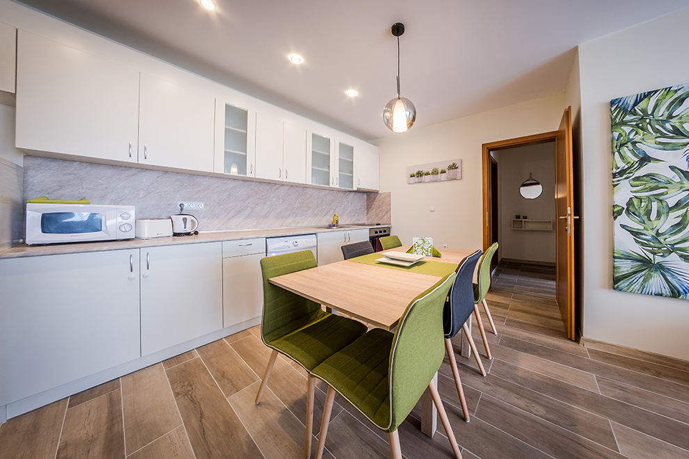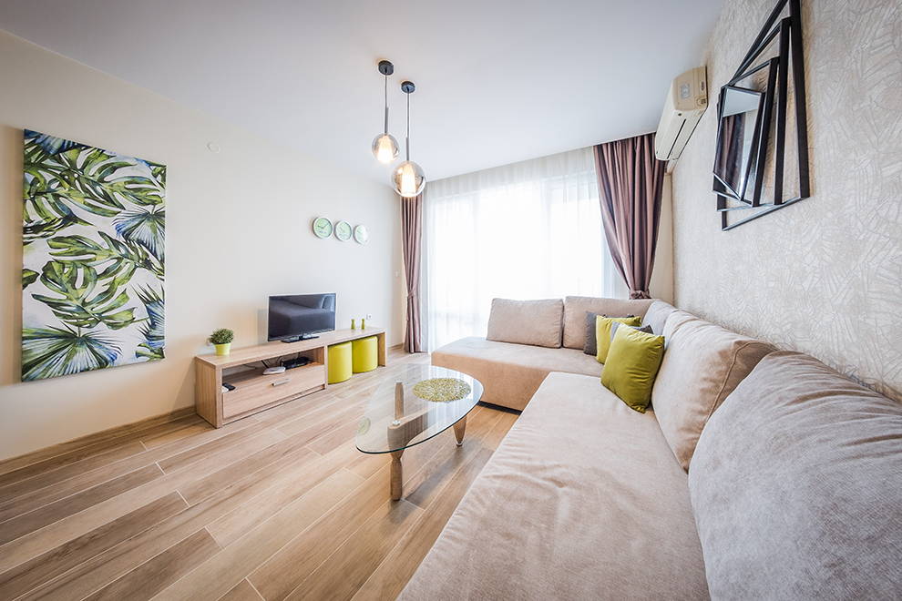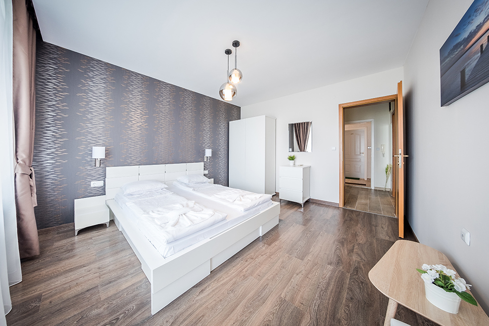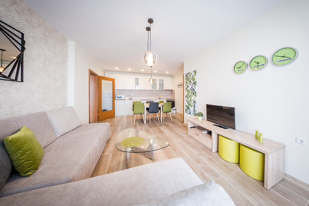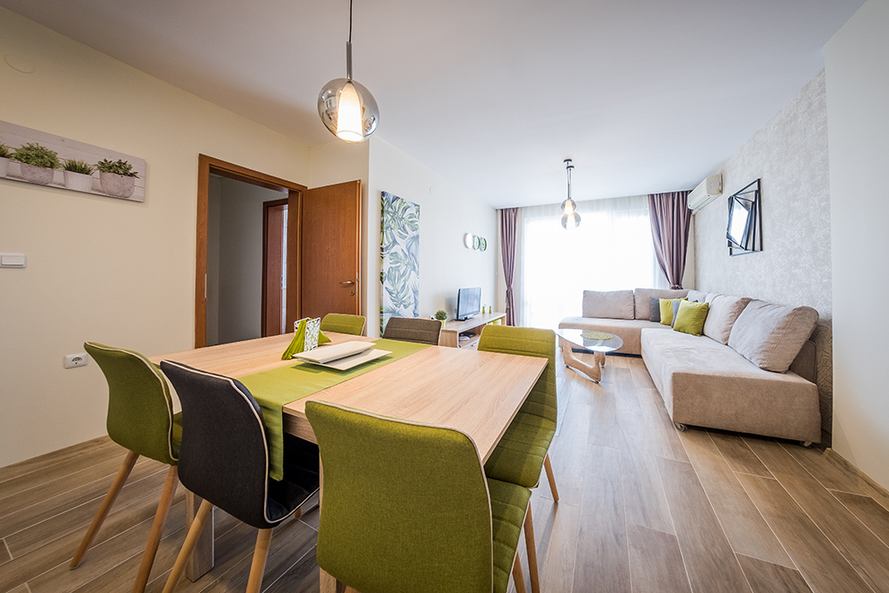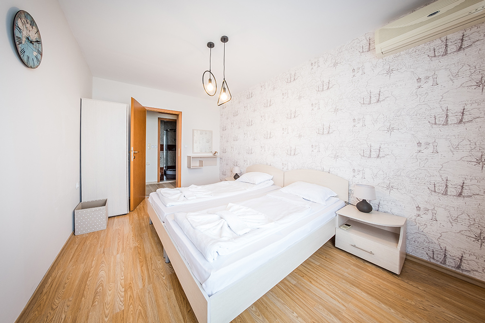 Апартаментите представляват комфортни студия, двустайни апартаменти с хол/дневна и 1 отделна спалня, тристайни апартаменти с хол/дневна и 2 отделни спални, всички напълно обзаведени – оборудвана кухня с всички уреди и прибори, нужни за готвене и хранене, цифрова TV, климатик във всяка стая, комплект завивки и кърпи. Условия за настаняване: студио – 2 възрастни; 2-стайни апартаменти – 2 + 2; 3-стайни апартаменти – 4 + 2.