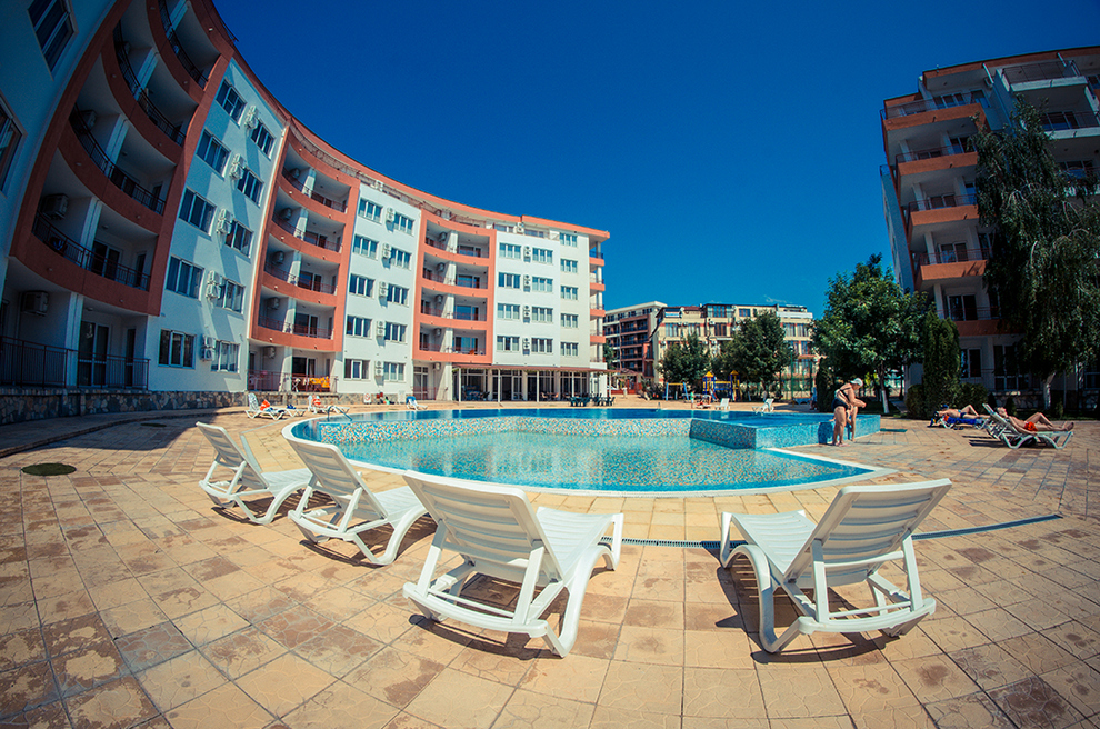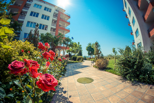 Добре поддържан двор, градини с декоративни храсти, цветя и тревни площи, басейн, ресторант, детска площадка, масажно студио и тенис корт / футболно игрище.