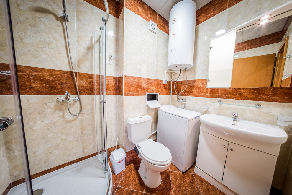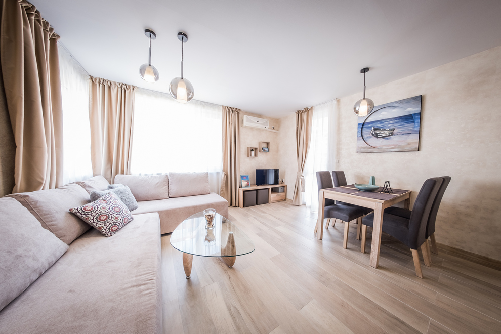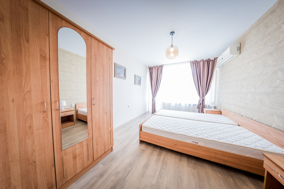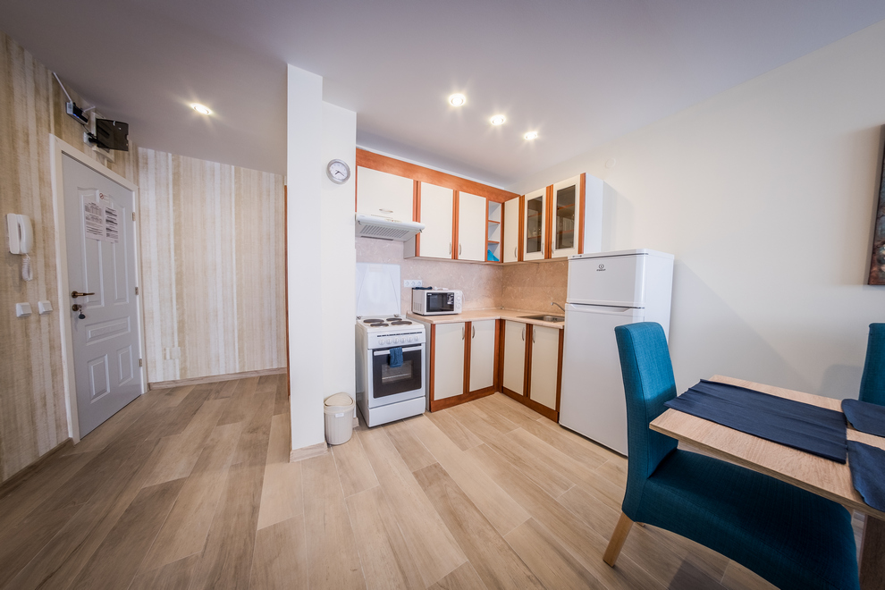 Апартаментите представляват комфортни студия, двустайни апартаменти с хол/дневна и 1 отделна спалня, тристайни апартаменти с хол/дневна и 2 отделни спални, всички напълно обзаведени – оборудвана кухня с всички уреди и прибори, нужни за готвене и хранене, цифрова TV, климатик във всяка стая, комплект завивки и кърпи. Условия за настаняване: студио – 2 възрастни; 2-стайни апартаменти – 2 + 2; 3-стайни апартаменти – 4 + 2.