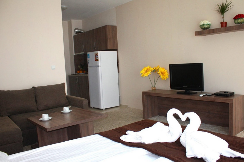 Апартхотелът предлага луксозни климатизирани студиа, обзаведени с компактен кухненски бокс с котлони, хладилник, кухненска посуда, спалня, холна гарнитура с маса, телевизор, баня с душ кабина, сешоар, тераса.