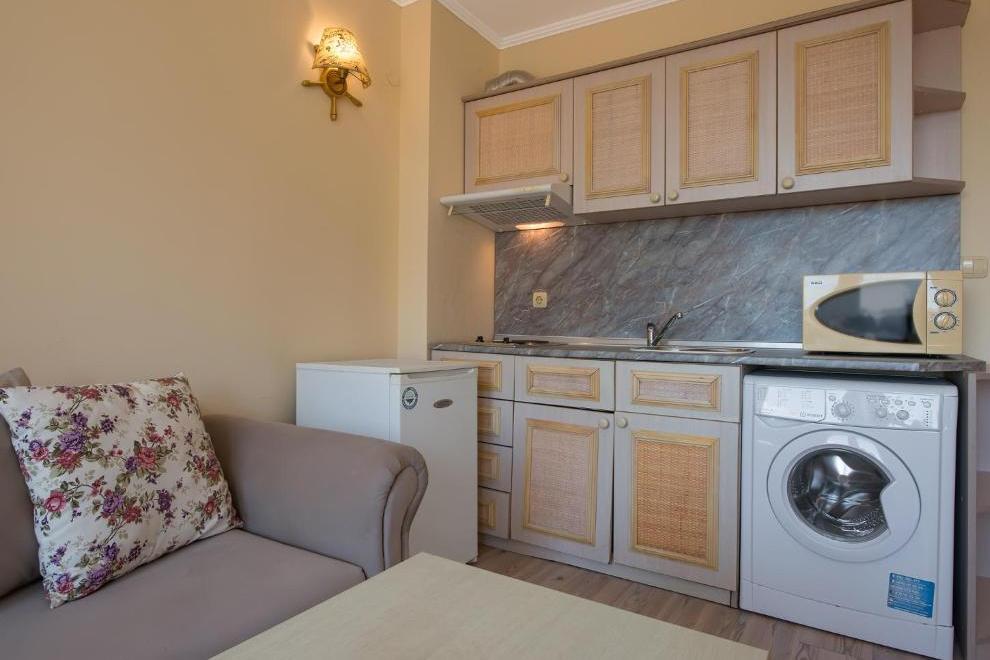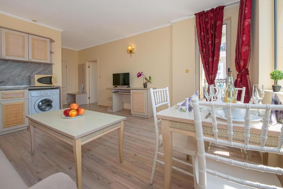 Апартаментите имат напълно оборудван кухненски бокс, дневна с телевизор с кабелни канали, собствена баня и балкон.