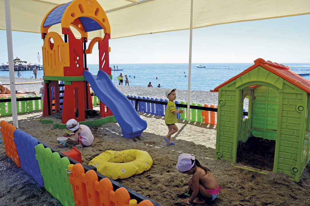 Хотелът има собствен пясъчно-чакълест плаж с два кея. Бар на плажа - отворен до 18:00 ч. Има и 2 открити басейна с 3 водни пързалки. На басейна и на плажа чадъри, шезлонги, матраци - безплатно. Плажни кърпи: безплатно.