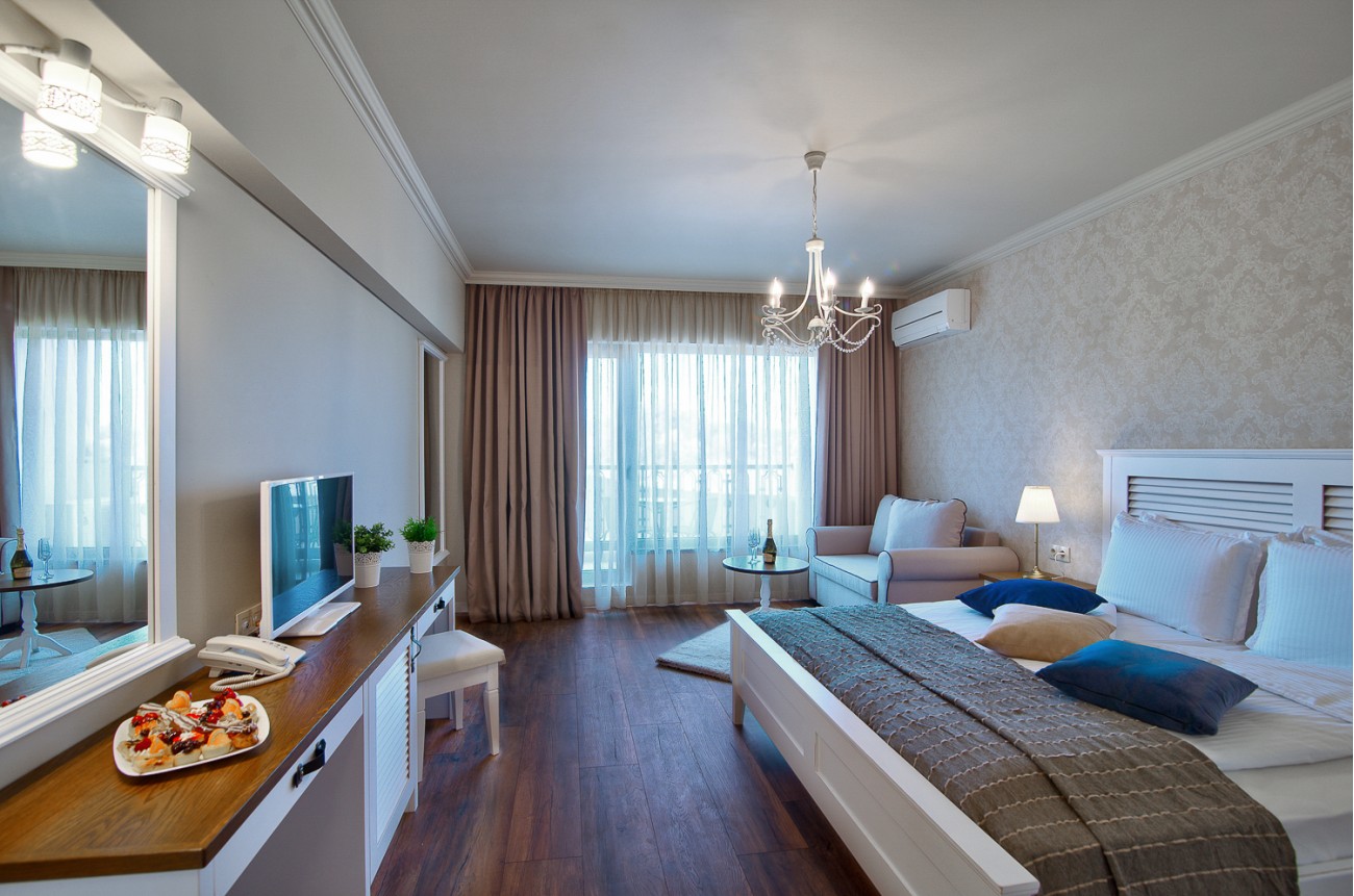 Стаите са дизайнерски обзаведени с елегантен декор и дискретен лукс. Всички стаи са с гледка към морето и предразполагат за спокойствие и релакс. Хотелът разполага с 62 помещение, от които 2 апартаментa, 3 фамилни апартамента, 2 студиа и 55 двойни стаи. Всяко помещение разполага с индивидуална климатична инсталация, LCD телевизор, кабелна телевизия, free WIFI, телефон в стаята, телефон в банята, мини бар, сейф, баните са с вана или душ кабина, сешоар, и халат за баня.