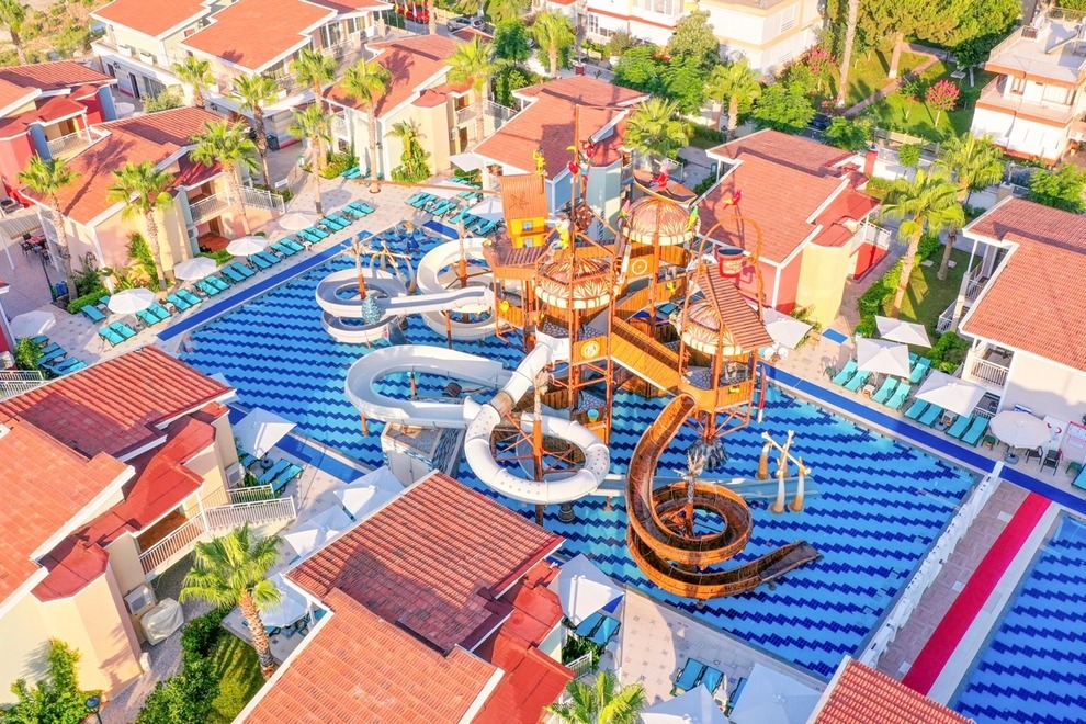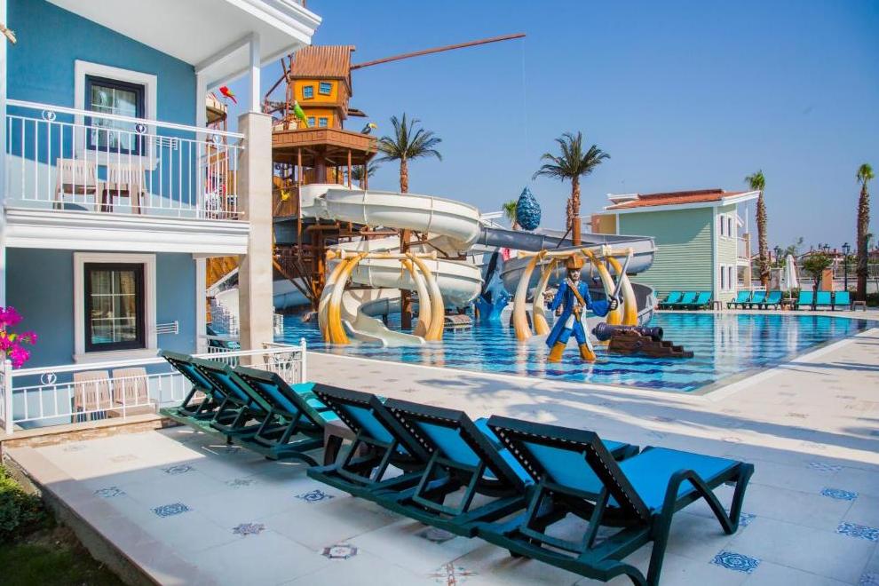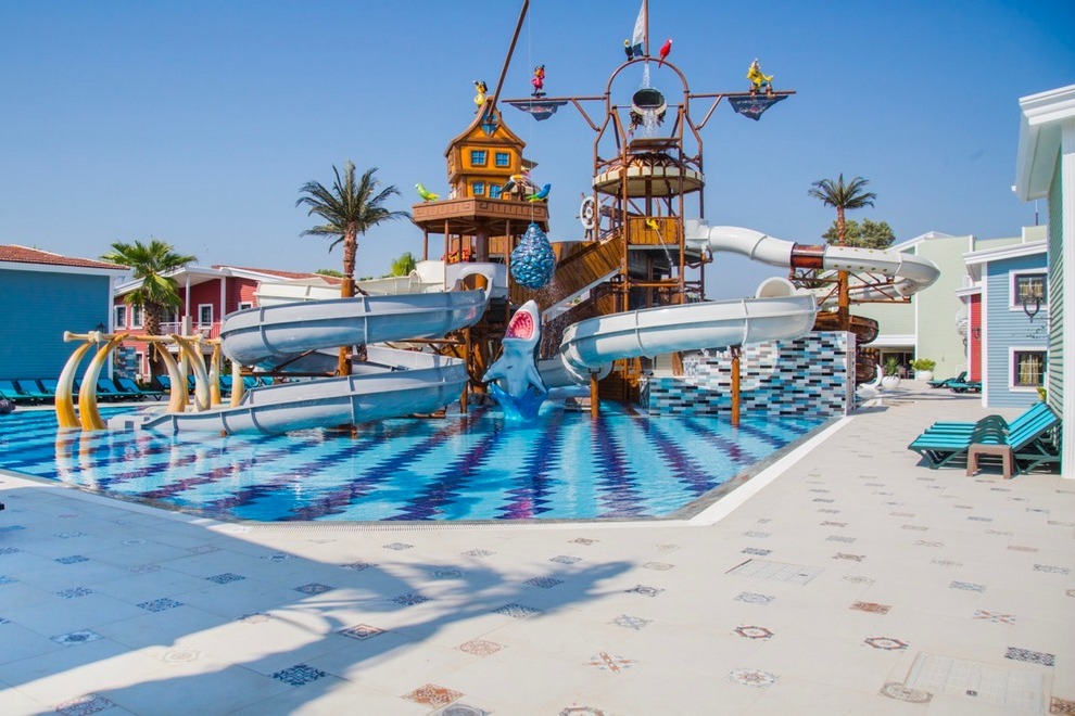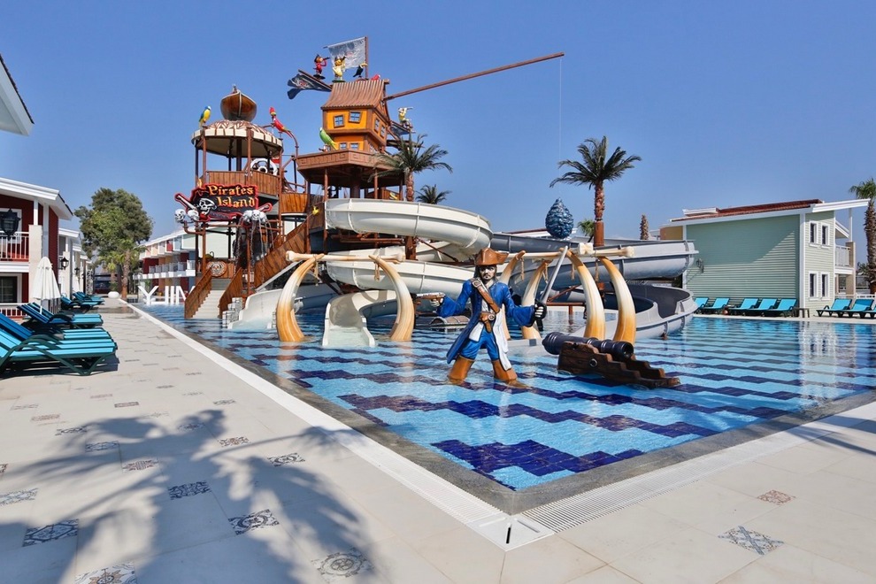 Собствен пясъчно-чакълест плаж на 450 метра от хотела с душове, кабини за преобличане, спасител, бар на плажа. Има осигурен безплатен шатъл до плажа. Открит басейн с 2 пързалки за деца и 3 за възрастни. Шезлонги, чадъри и плажни кърпи на плажа и при басейна се ползват безплатно.