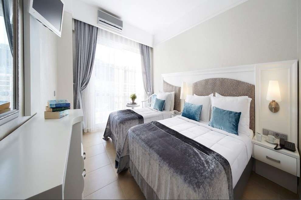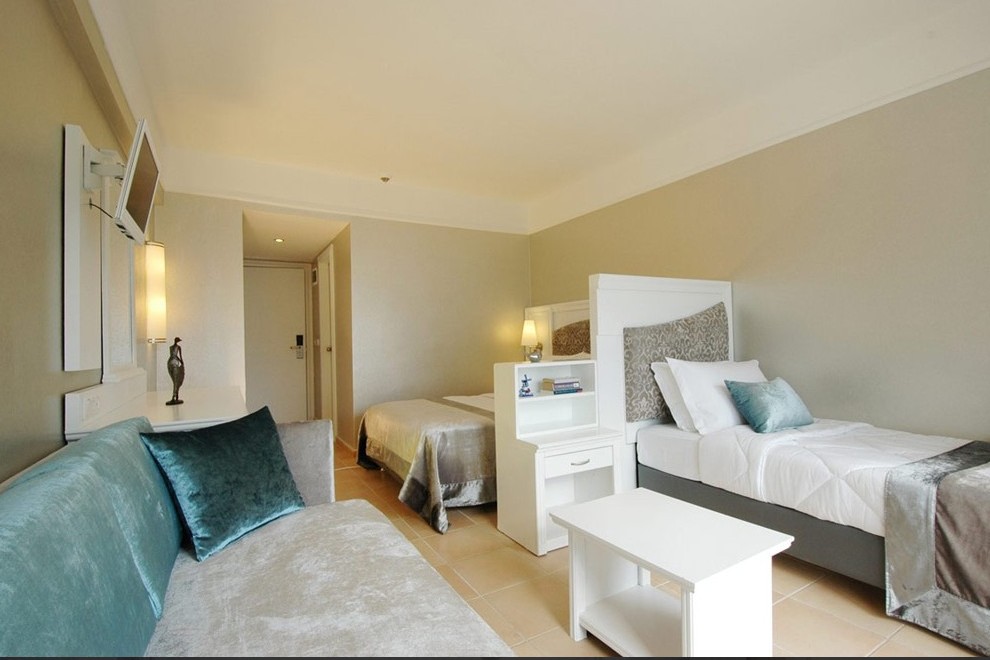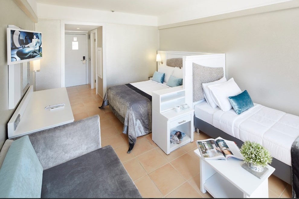 Хотелът се състои от 5-етажен корпус с 220 стандартни стаи (28кв.м., макс. 3 човека), 4 стаи за инвалиди, 48 family room (35кв.м., макс. 4 човека, баня с вана). В стаите има Баня с душ, индивидуален климатик, телефон, телевизор, сейф (срещу заплащане), балкон, room service (срещу заплащане), почистване на стаите - всеки ден, смяна на бельото - 3 пъти в седмицата, смяна на кърпите – 3 пъти в седмицата.