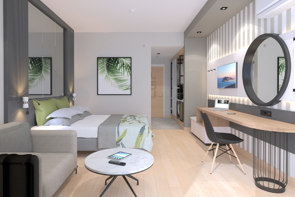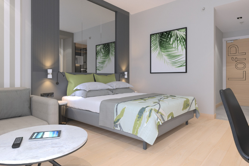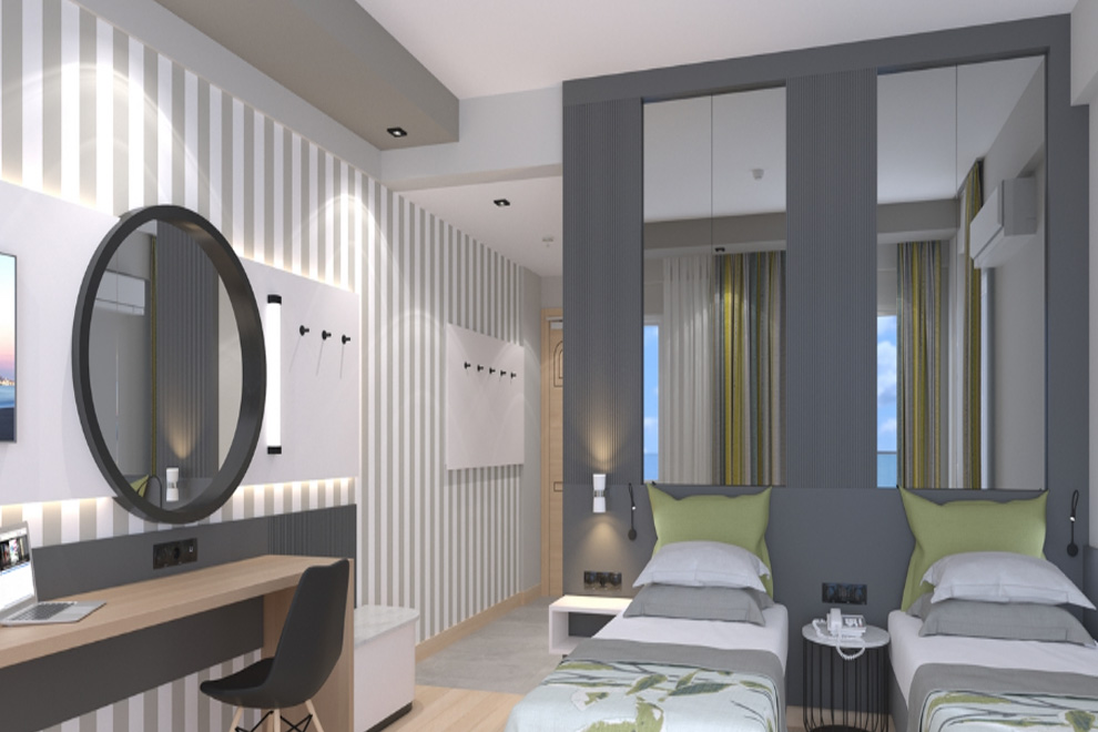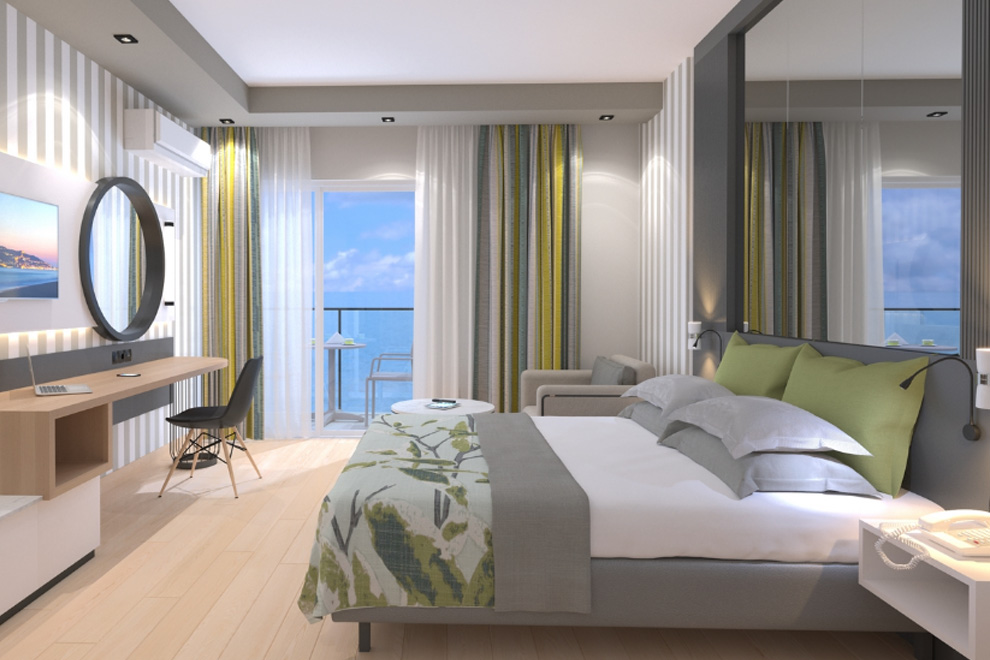 Хотелът разполага с едно 6-етажна сграда, и четири 4-5 етажни корпуса, в които има 156 standard rooms, 47 едностайни family rooms. В стаите има индивидуален климатик, сейф (платено), телевизор, минибар (в деня на пристигане е заредена вода безплатно), баня с душ, сешоар, телефон. Стаите се почистват ежедневно, спалното бельо се сменя три пъти седмично.