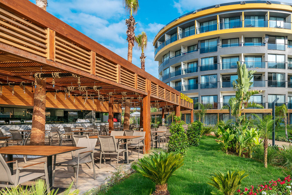 Разстоянието на хотела до морето е 1200 м. Хотелът има собствен пясъчен плаж, до който се стига с автобус (безплатно). На плажа има бар. Хотелът предлага още 1 открит басейн, площ 700 кв.м. (неотопляем). 1 закрит басейн 160 кв.м. (отопляем през зимата). 6 водни пързалки за възрастни и 2 за деца, работно време 10.00-12.00 ч. / 14.00-16.00 ч. На плажа и при басейна хавлии, шезлонги и матраци се предлагат безплатно. .