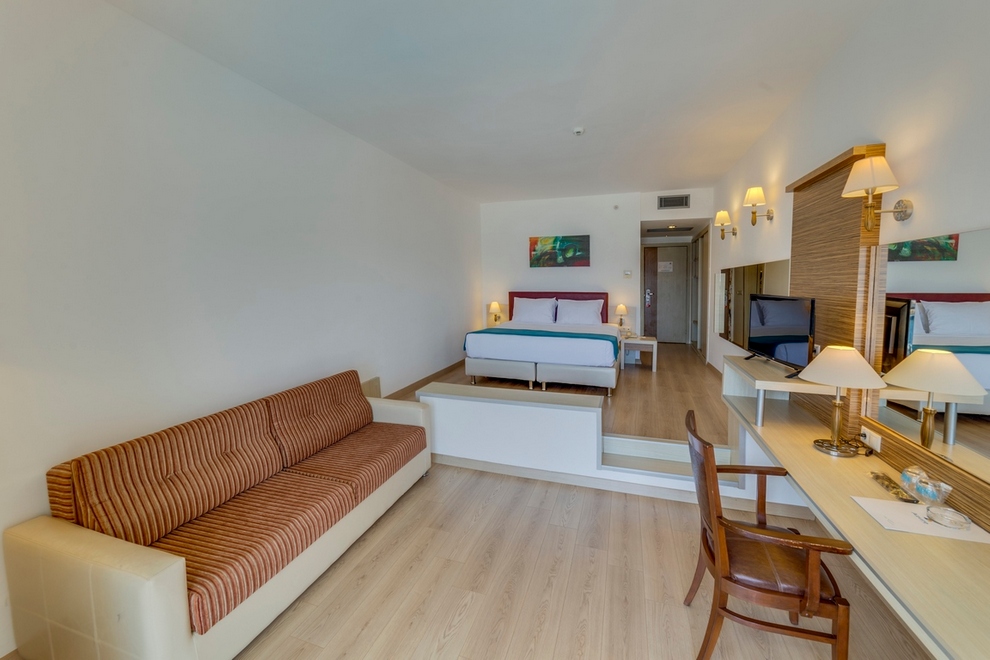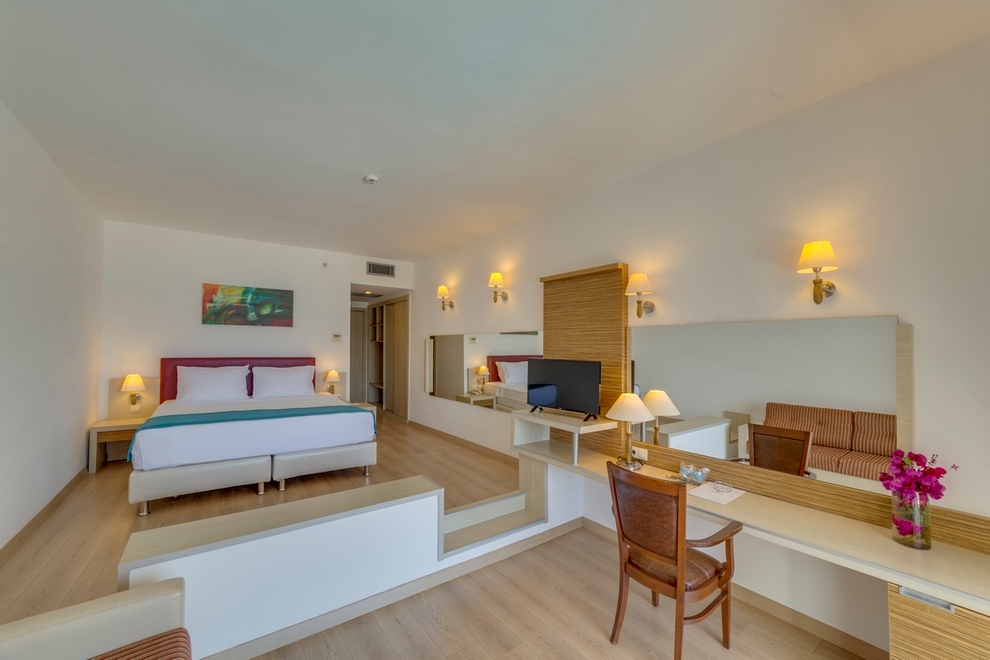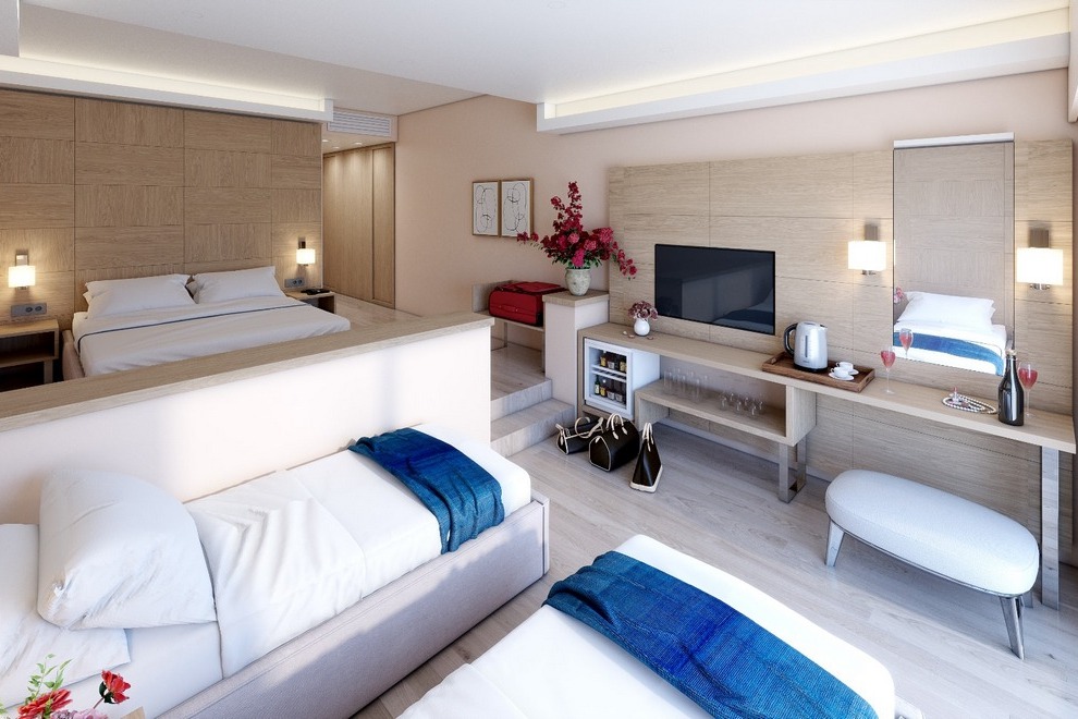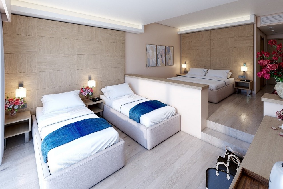 Superior Room с гледка море, френско/единично легло, 1 баня с душ, балкон, площ 45-50 кв.м, максимално настаняване 4 души.