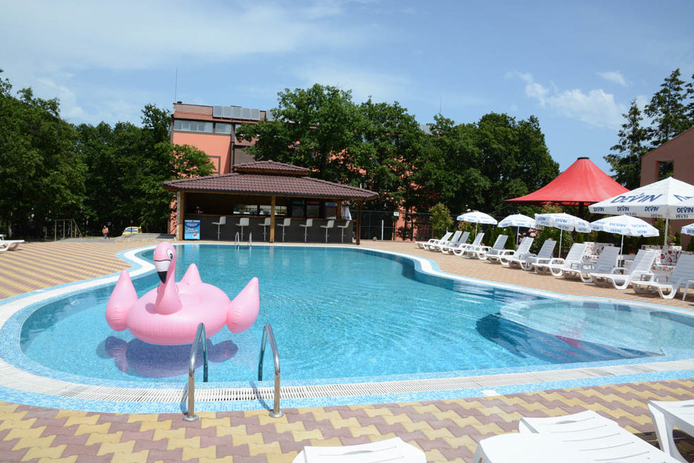 Хотелът разполага с 84 комфортно обзаведени реновирани стаи, като всички са оборудвани с климатик, телевизор, баня с душ. Стаите разполагат с балкон/тераса. По-голямата част от стаите гледат към парка, в който е разположен комплексът. Видовете стаи които предлага хотела са двойки 2+1 с възможност за настаняване и дете, студио (обширна стая с капацитет 4 човека) и мезонети на две нива с отделна спалня, хол и балкон с капацитет 5-6 човека.